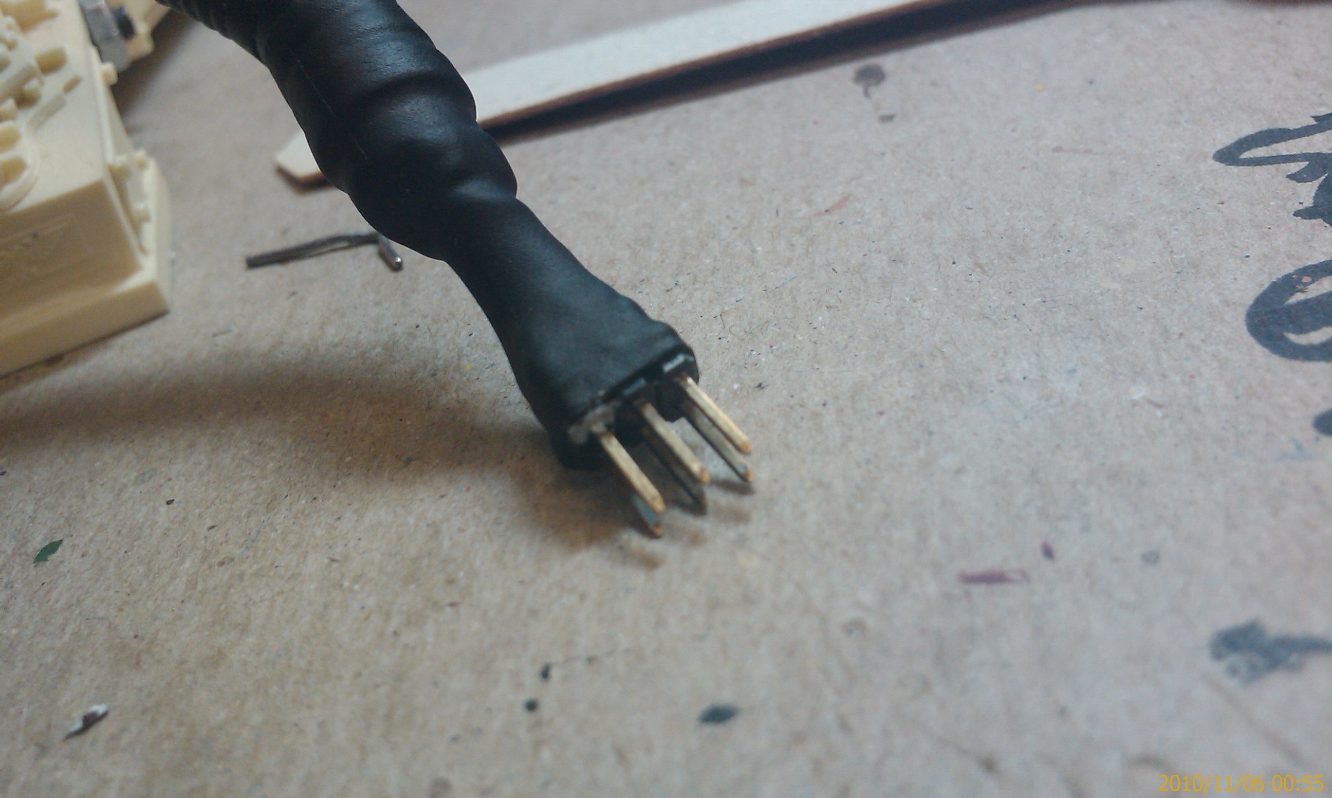 Here's a pic of the progress achieved last night. It doesn't look like much but the 4 of them took almost 2 hours. The toy's wires were soldered to the connector, each was wrapped in heat shrink, then that whole assembly was wrapped in heat shrink.