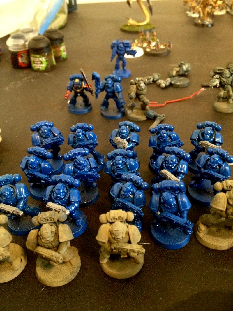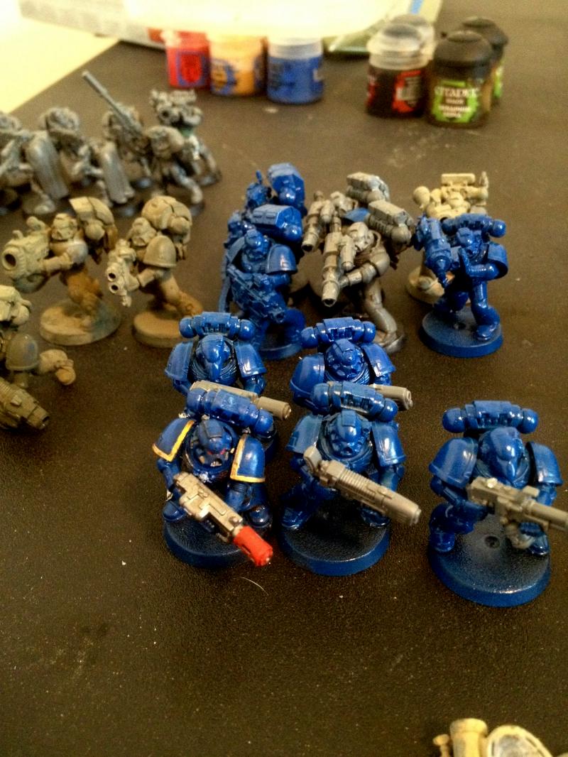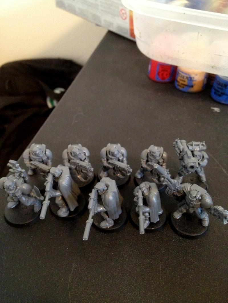 14 Bolter Marines, 2 assembled "Sergeant" marines in background.