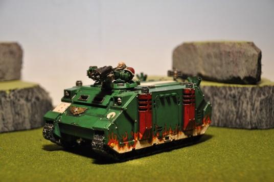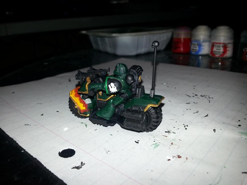 Some friendly suggestions: 1) you have no color on your exhaust, guns or your rims. They're metal, just a layer of leadbelcher will make a huge difference. Even if you wash it with a black wash after, I think it'll come out with an effect you'll like. 2) You have no highlighting and it makes the paint effect seem drab and flat. I would suggest dry brushing maybe a mix of a lime green with the dark angel green across the majority of the model, and then doing another dry brush of just the lime green on either edges or on the portions of the model that catch the light 3) The fire effect looks cool, but very "thick," as in it has the characteristics of none of the other layers of color as it continues from red to yellow. I think in the future, if you're going to do it again, I would go from red first as you have it now, and then divide it into 5 sections. Section 1 is the whole thing, and should be red. Section 2 should be from the very front to the back 4/5ths of the intended fire section, and should be a mix of red and orange. Section 3, the same but 3/5ths and just orange. continue in 5ths, blending the colors as you go forward, using a little less each time. These things said, I do like the concept and I think you're on the right track