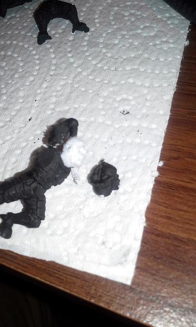 I knew I wanted him holding a sword in that hand...so first things first...I drilled out the grenade, and cleaned up the area: