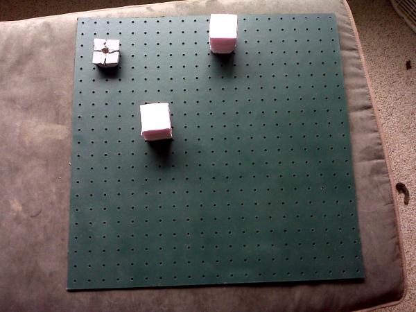 I have been playing around with different materials as potential terrain/boards for Endless. The first is a pegboard play surface. 1/4 inch pegboard with holes 1 inch apart gives an instant grid. I just cut it down to size leaving half an inch around the end to make it look cleaner. Green spray paint for color and I've got a regulation 20x20 square board thats ready to be populated with terrain. The foam blocks are the start of 2 and 4 elevation high rock outcroppings.
