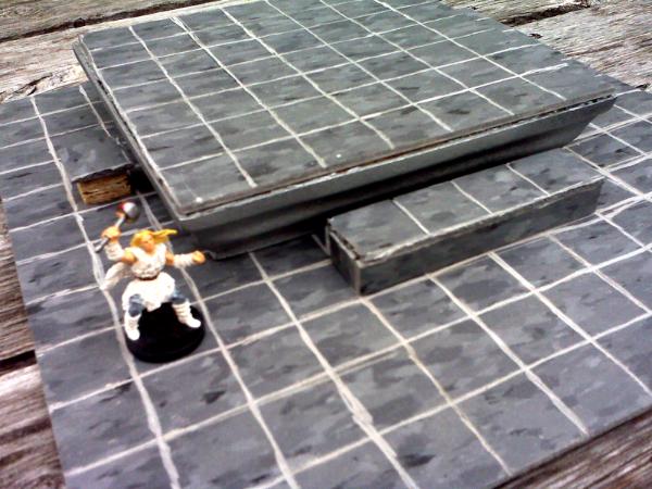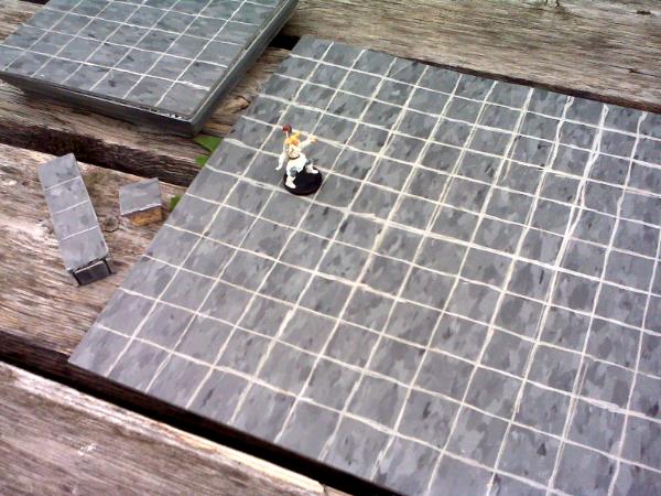 This is some grey vinyl floor tile I picked up at a surplus building supply store for 25 cents a tile (one foot square.) I had to grid them myself. I drew the grid on the tile and went over it with a rotary tool. The tile is brittle so I need to back it with something like the pegboard before using it. it is a simple way to get a dungeon feel without bringing out the paints.