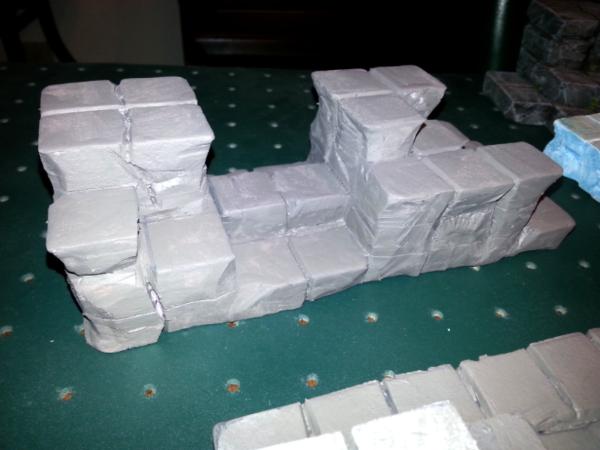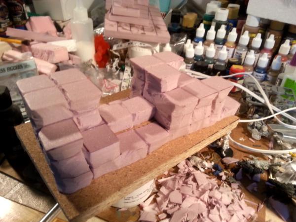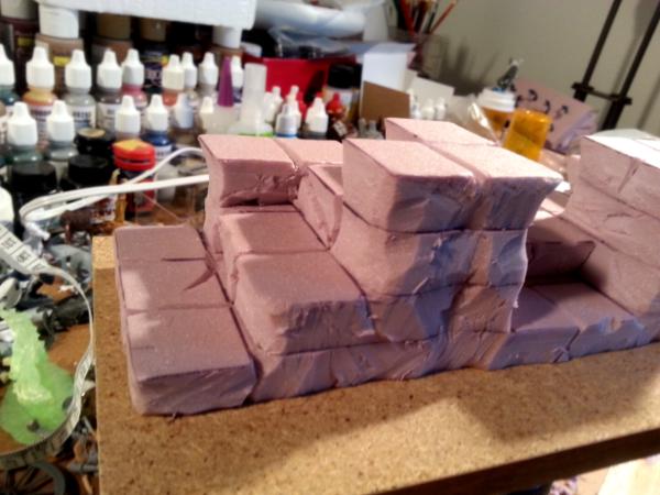 Here are more hills I threw together over the weekend. All in all it just took a few hours for cutting, gluing, and the base coat. Now I just need to dry brush and add a bit of flock. All it took was a sheet of half inch pink foam, hobby knife, glue gun, and cheap paint. I still have half the foam left too.