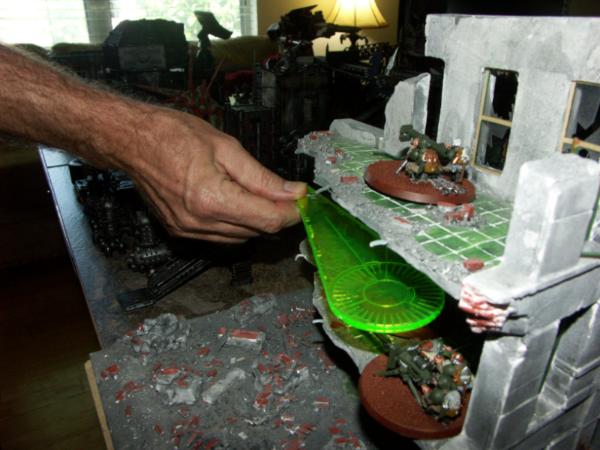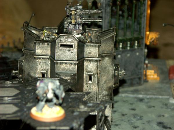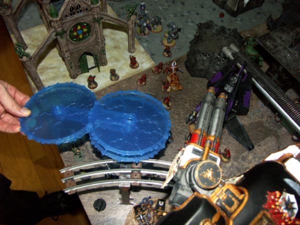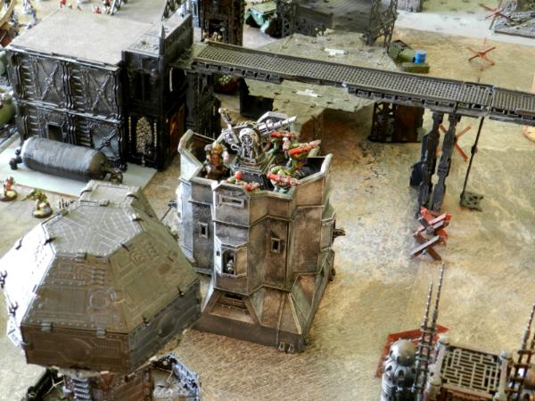 Note: The plague towers start in the middle of the board and move 6” towards the launching pad every turn. While the weapons have been disabled, the explosion of filth rule still applies when they are destroyed (long range fire is advisable).