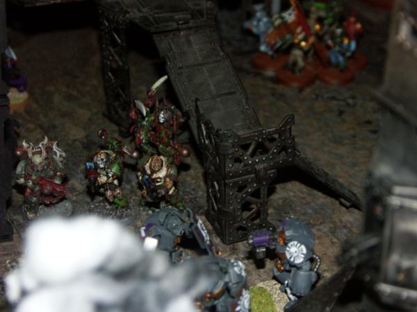This was a very fun battle, and I learned a lot about "not being left behind". I had marginal effect on the outcome, as I couldn't bring my force to bear where I needed to (busy dealing with Obliterators, Mutilators and terrain).