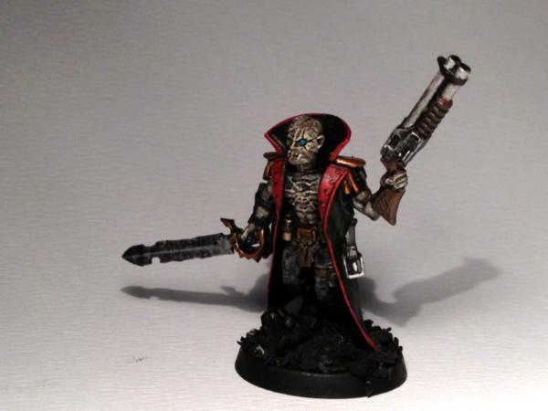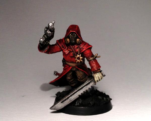 Green stuff closed up the robe, and I sawed off someone's autopistol for him. Don't know where the sword came from, it was in my bitz box.