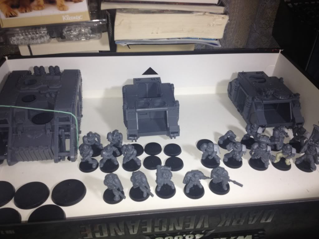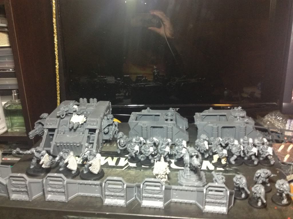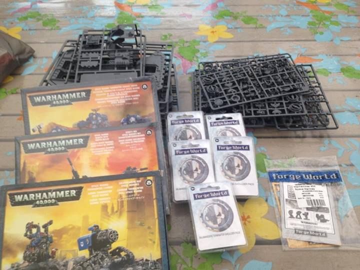 What you can see here is 1 tac squad (plus 1 more not pictured), 2 rhinos, assault terminators, a land raider redeemer, Thunderfire cannon, and a box of scouts, PLUS, some Forgeworld shoulder pads (power armour and terminator armour) and lastly some Forgeworld Etched Brass