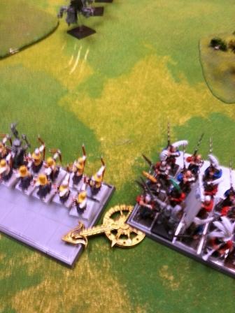 I was very lucky with my army selection, which I had made without knowledge of what akaean's list. The choice of lore of heavens was extremely fortuitous for me because, not only did it allow me to snipe his lord (amazingly!), it was a tremendous force multiplier in combat. Harmonic convergence was essential to winning combat against those Men-at-Arms. Re-rolling a 2+ save or a 2+ to wound saved my Demigryphs from taking any wounds for at least a turn while dishing out the pain themselves. I was also felt like I was lucky by putting a Dragonbane Gem on my Captasus. Knowing he had a 2+ ward against several of his key units (peasant bowmen, BSB, Palasus) made me feel that I could be somewhat reckless with him.