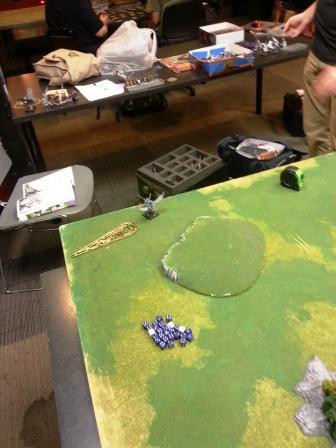 Empire Turn 3 And Jason comes in! He was just workin on his Seraphim and spectating. He was a good sport and occasionally looked stuff up for us! He was in a *lot* of the pictures from this point on because of his seat, but I've cropped him out of most of them! Hi Jason, he plays Skaven.