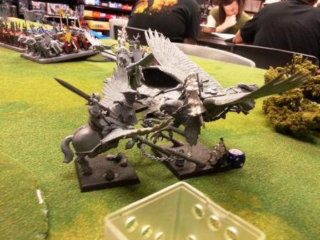 Magic Blows 5v3, Wizard Lord throws 5 dice into Ice Shard Blizzard on the Hippo, and gak hits the fan. Roiling Skys rolls up 4 hits, ALL of which roll high enough to be allocated to the Lord. 3 of those wound, and the Lord fails 2 saves, sending him plummeting from his Hippogryph to the earth below! An incredibly lucky magic phase for the Empire. The Hippo passes his leadership test, and continues on as a separate unit.