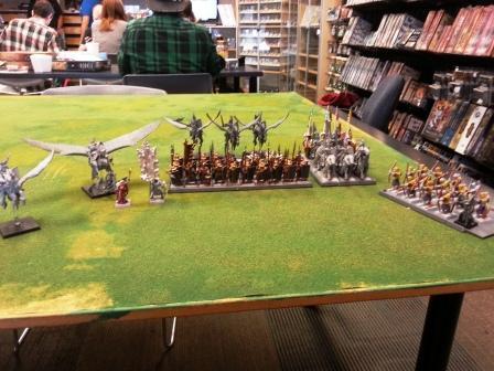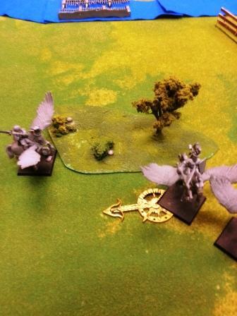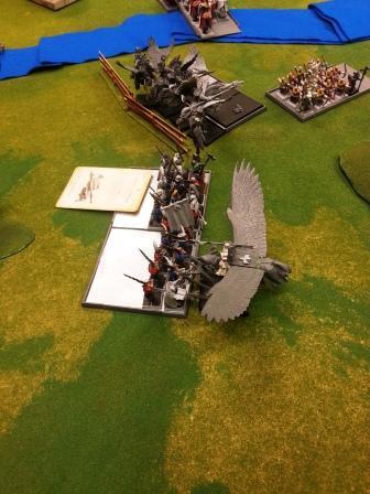 Empire turn 4 Great Swords charge into the Men at Arms, and the Captain flys behind my Pegasus units. Not many unengaged units remain!