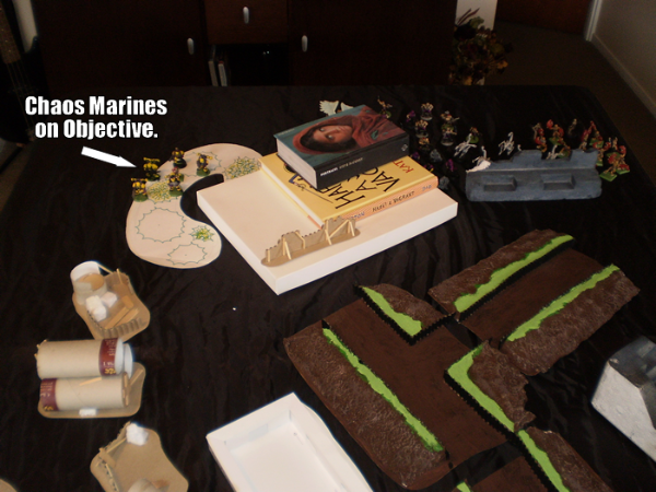 Daemons deploy first, reserving the Seekers, Chaos Bikers with the Allied Chaos Lord and two of the Daemonette units. The Marines reserve the Obliterators and decide not to Infiltrate anything. Marines fail to seize, Daemons take first turn.