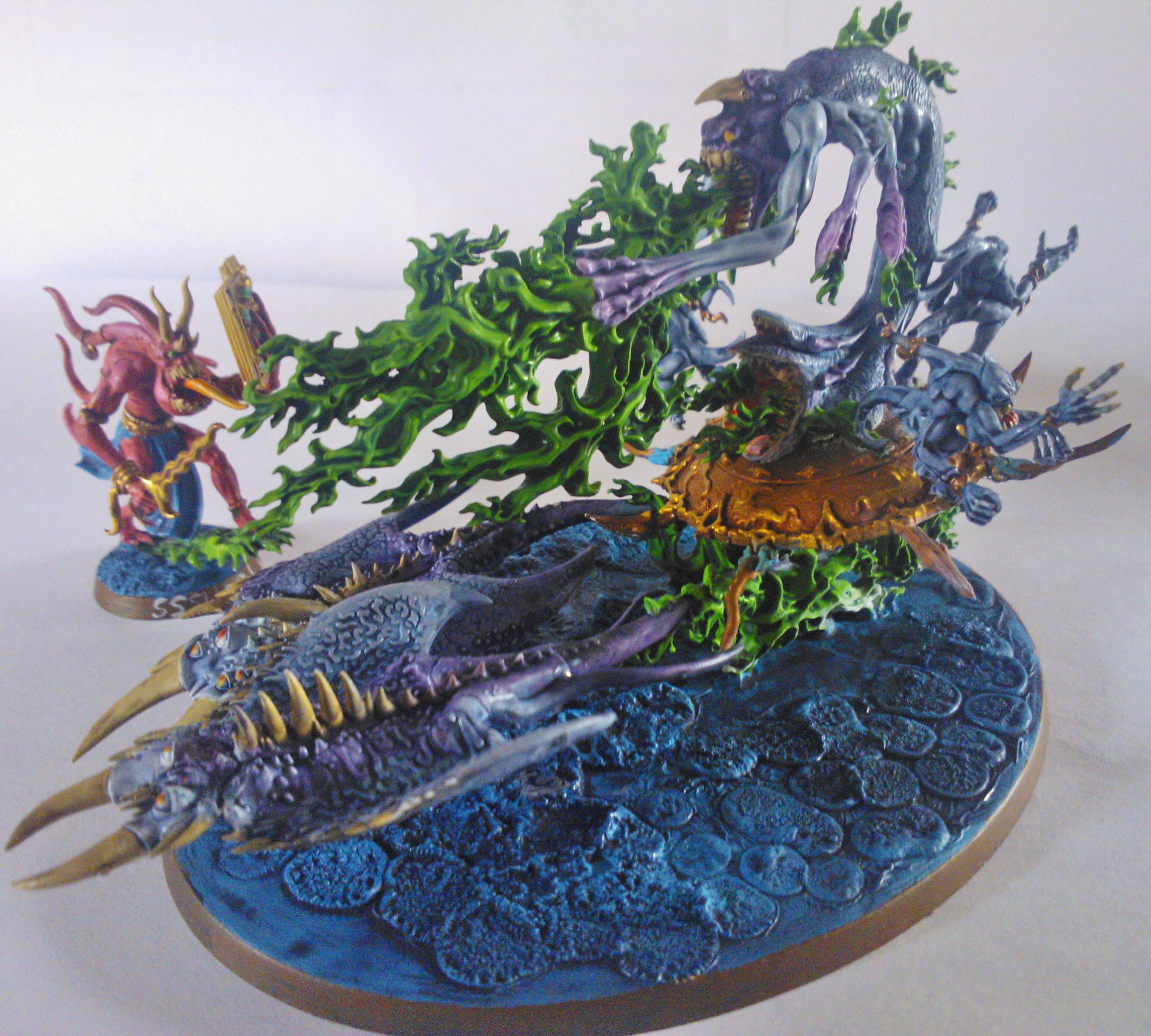 My aim was to make it look like the Daemons were mutating the land about them. Add some green stuff around the bitz where they were glued to the base and tease it/swirl it to make it look like raw magical energy is feeding this unnatural growth.