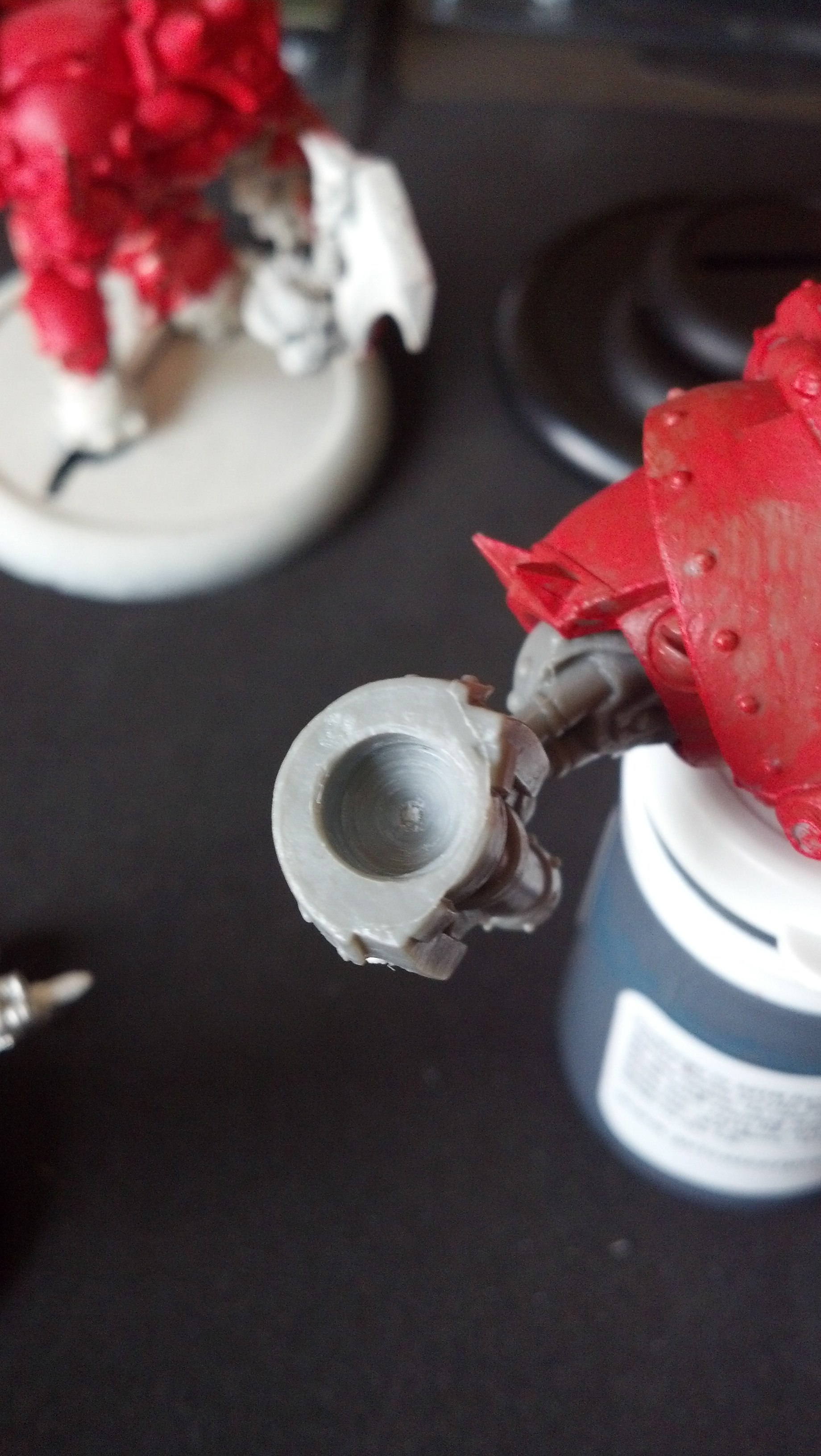 Once you place a magnet in one side of the joint and allowed the glue to cure, place another magnet on it, then score the side of the second magnet that is facing outward. I use a knife or file for this, but anything you can use to mark the side facing out should be fine. Remove the second magnet, and glue it with the marked side facing down in the opposite joint. This is quite critical - magnets have poles (North and South) that will repel each other (N repels N, S repels S). It is quite depressing to accidentally glue the two magnets in a shoulder joint with the same pole facing each other, as you will never get the magnets out again.