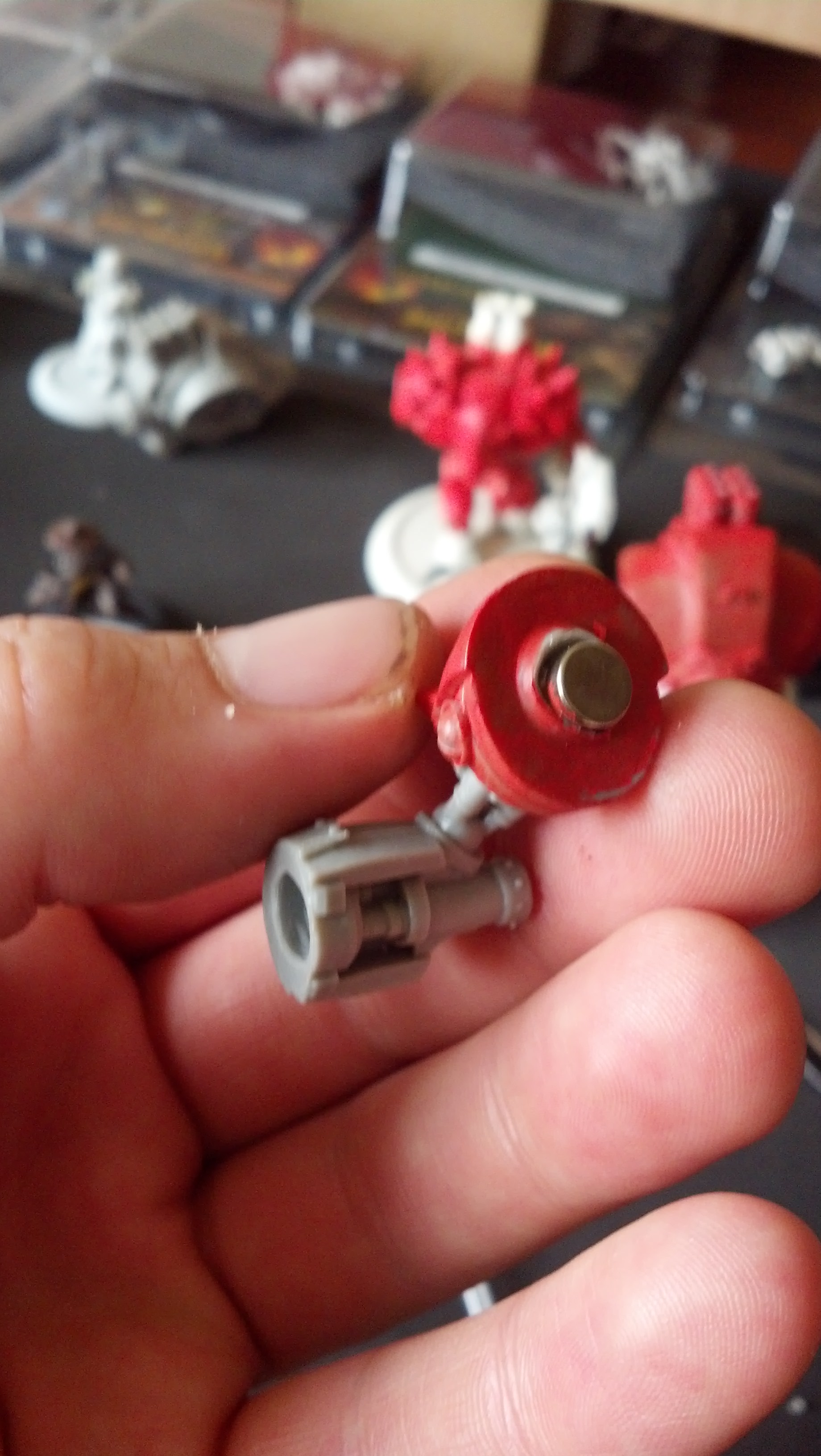 Materials I am using: 1/4"x1/8" and 1/8"x1/8" Neodymium rare earth magnets (nickel plated). The 1/4" magnets have a pull force of around 2.7lbs, the 1/8" magnets have a pull force of about 1lb. Either is more than enough to hold a warjack's limbs together.