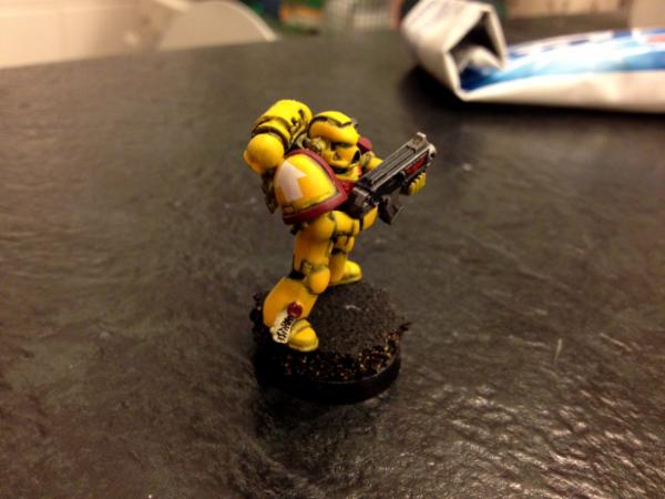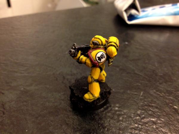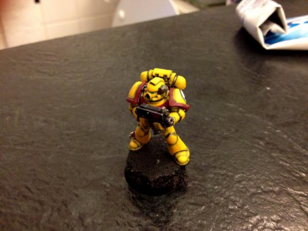 Hey guys, Here is my Imperial Fist test model. Along with my Ultramarines, I'm including some marines from other chapters in my list (despite the numerous meltdowns people are having re: Chapter tactics and Special Characters) The theme of my UM army is a bunch of marines from different chapters banding together while on some campaign but under the general command of the Ultramarines. Chapters I intend on including are Imperial Fists, Blood Ravens or Blood Angels, Aurora Chapter, White Scars and maybe Black Templar or Deathwatch. The biggest reason I chose to include different paint schemes is because I get tired of painting the same colors over and over and schemes like the IF are very unique and fun from a hobby perspective, as is painting red, green, etc. PS- I know the base is not complete yet, that will happen after the squad is done in a batch-style project. So, just ignore criticsm of that for now. Promise I'll get it done! So, let me know what you think of him!