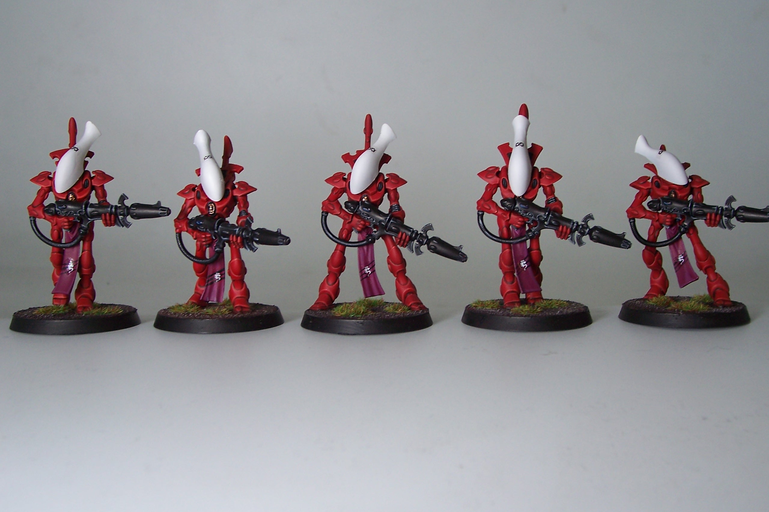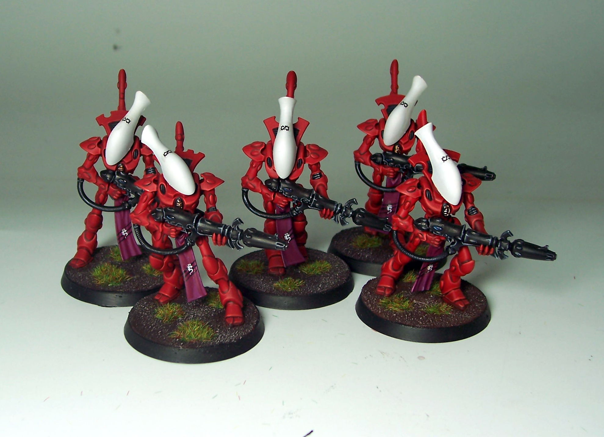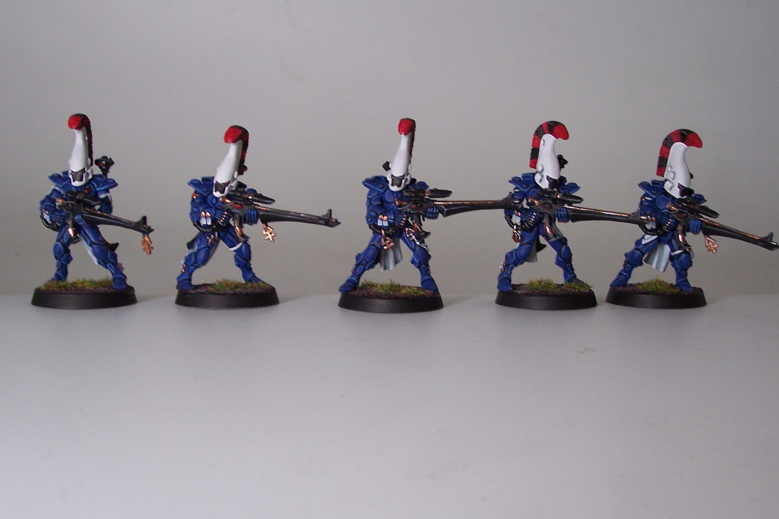 It all looks pretty awesome to me! Really not helping me resist the urge to start Eldar. My two cents would be maybe add some highlights to the bristles of the Dire Avenger plumes. The red segments seem too plain.