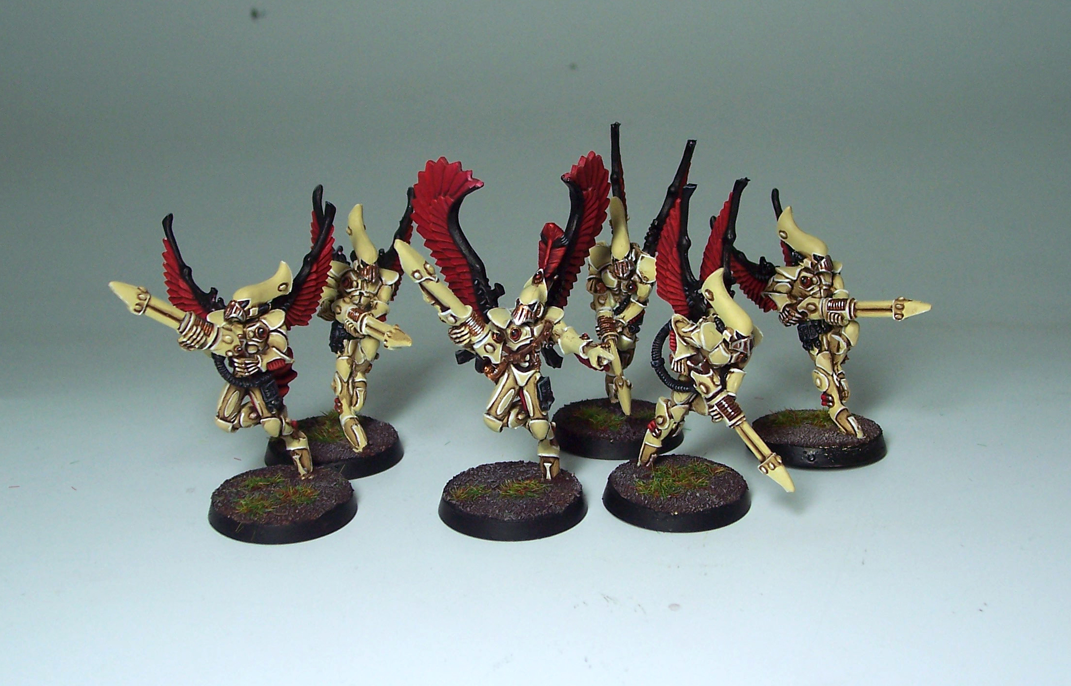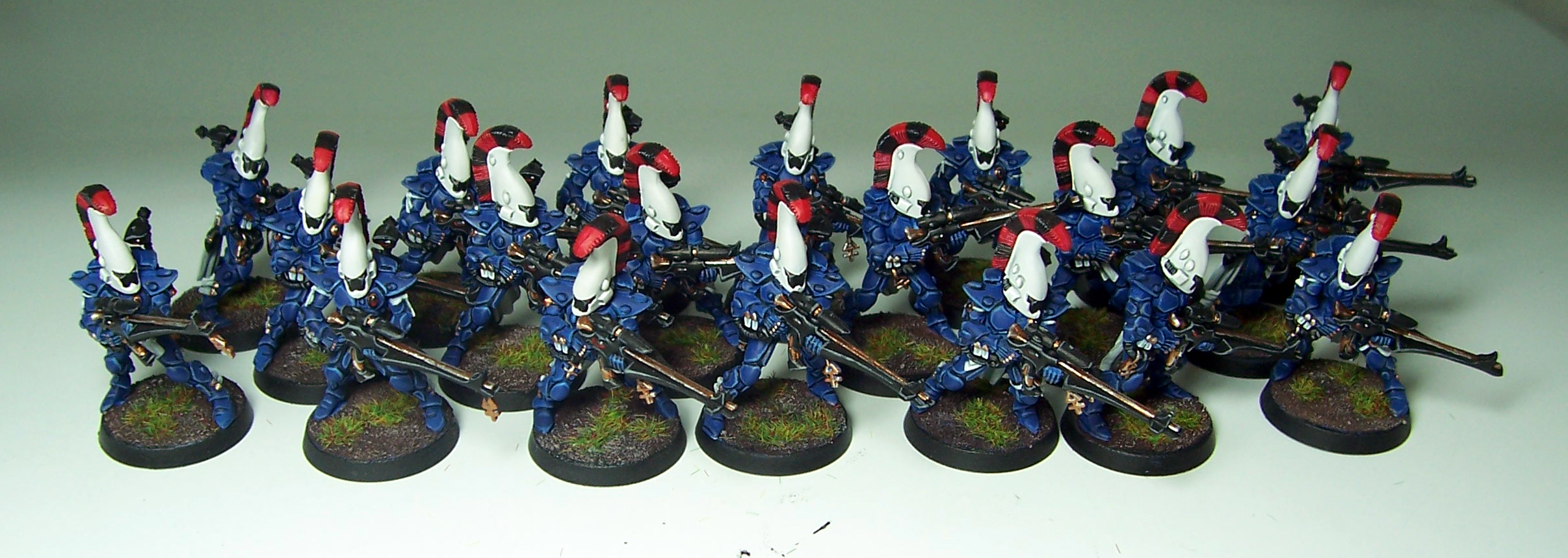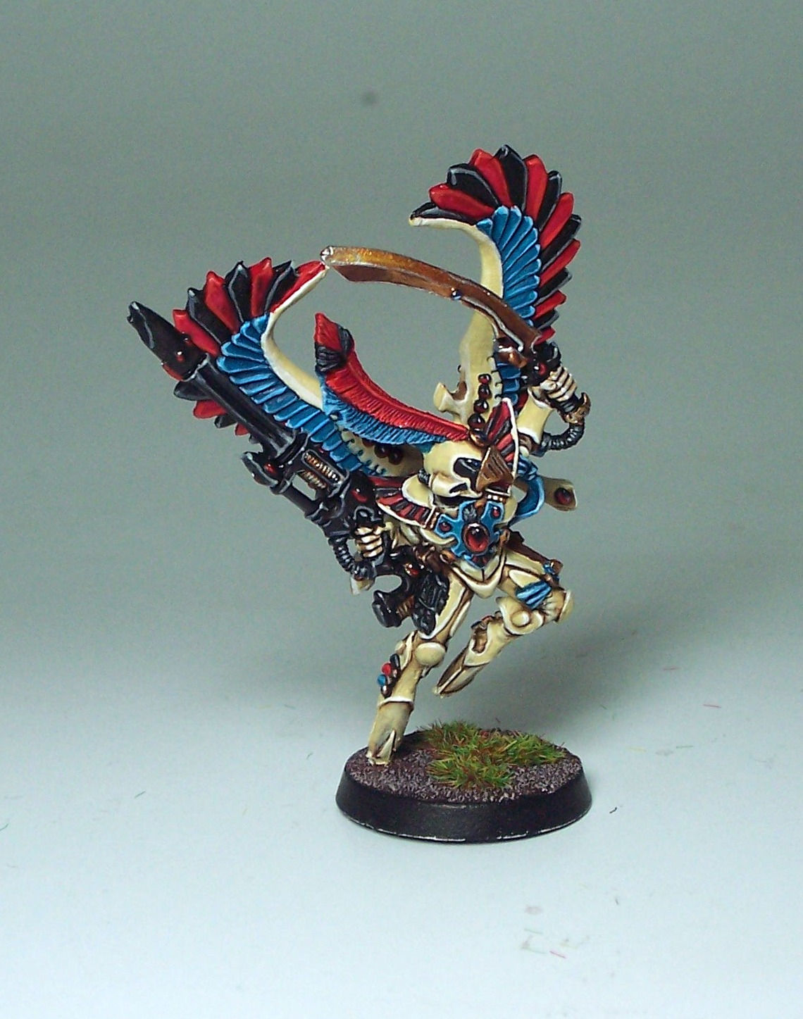 It all looks pretty awesome to me! Really not helping me resist the urge to start Eldar. My two cents would be maybe add some highlights to the bristles of the Dire Avenger plumes. The red segments seem too plain.