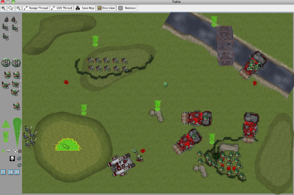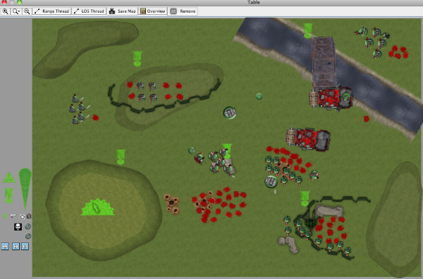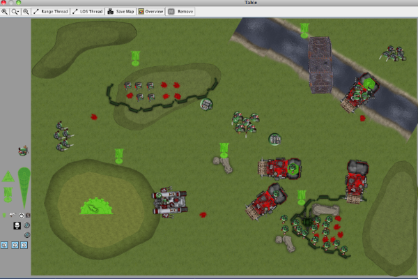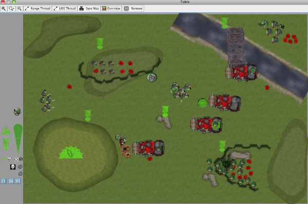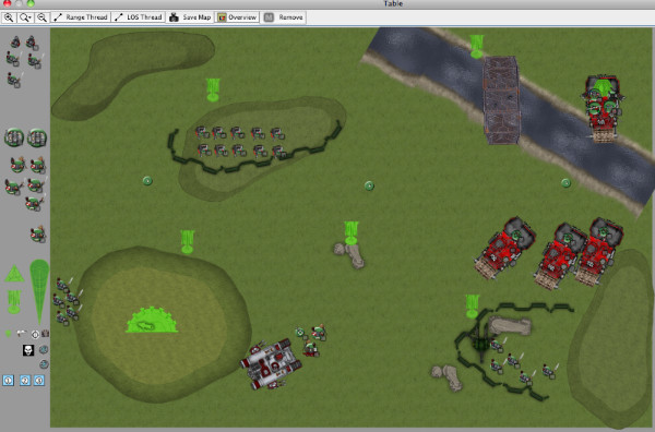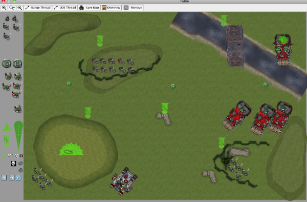 This battle is my fun GK Flame Dread list against an Ork Battle Wagon list, in which my opponent clearly stated his intent was at a minimum to run over as many things as possible with his Deffrollas. This is my first time using Vassal to do a batrep, so bear with me. Mission was objective-based, and our friend called it "the dude". Each player had a "dude", and if the game ended with the dude near the center objective, it was worth an extra 3 points. If you could capture the other player's dude, it was worth more points as well. Also there were bonus points if one player had more units in the opponent's deployment zone. All objectives worth 3 points as normal.