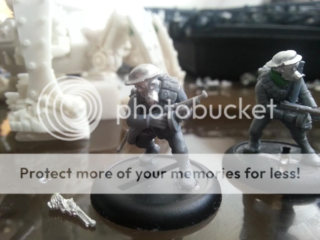 the tommyguns were made by chopping the magazine of the m1a1 thompsons that came with the kit, and chopping of slices of the round bit of GW sprues. the flamethrower was med from a light mortar and tha tanks from SM flamers