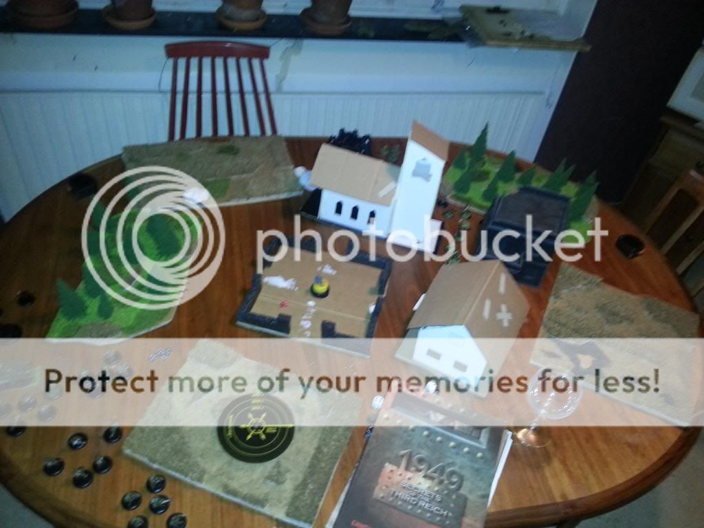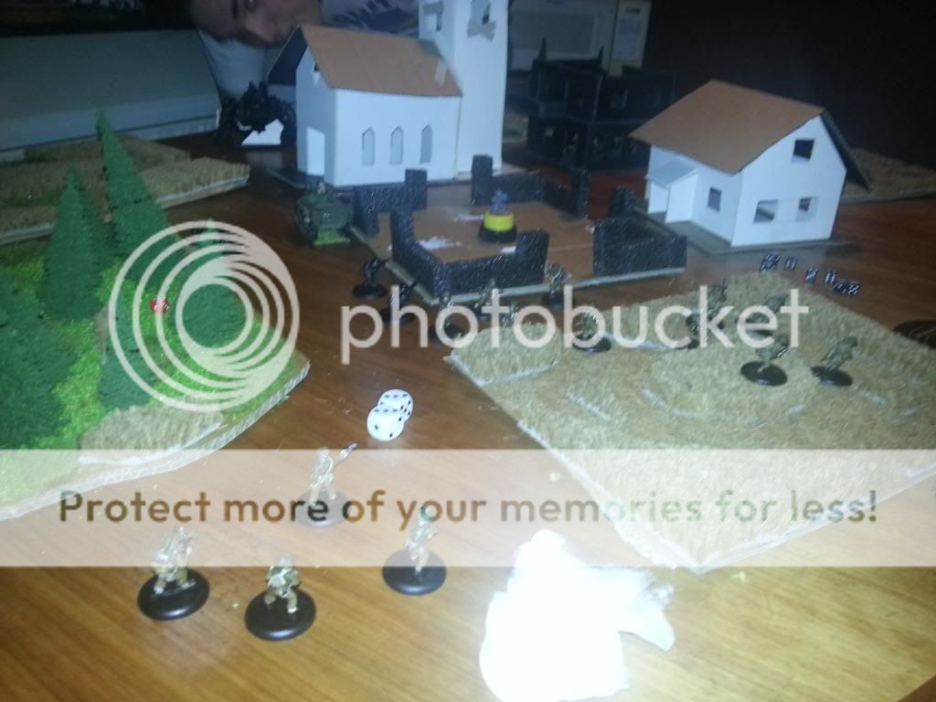 I win initative round one and my sappers haul ass into the wheat field, whilst the russian mortar teams put a round on my MG team, downing one model but killing none. His command team, one sniper and at rifle team into the apartment building, and firing on my northern fireteam with his sniper and mecha, killing two. i move my squads forwards toward the square, using the walls as cover, my Stuart tank rolls forward and lets loose two of its machine guns, killing one and downing another of the russian infantry in the eastern wheat field.
