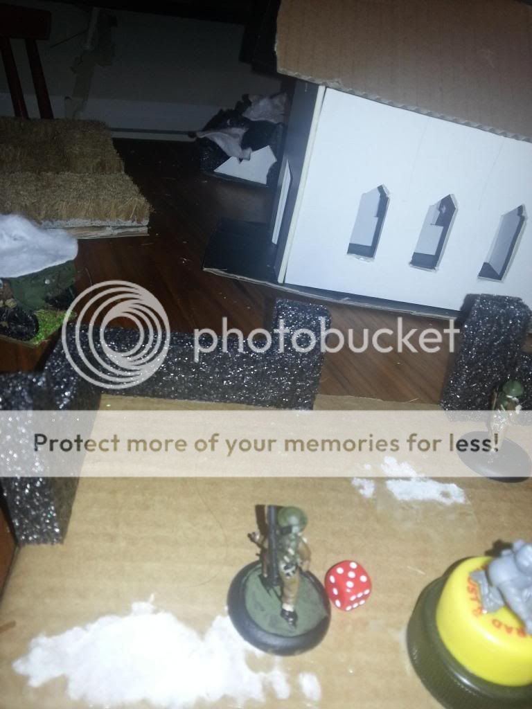 my Stuart continue to lay down fire on the Infantry in the weath field, killing two and downing another, and my Bazooka team fires on the second floor of the apartment, destroying a wall and collapsing the roof, killing all models on the floor except the AT rifle, who is down and the the command squad fails their casualty test, becoming disorganized. my sapper moves cautiosly forward, dropping their smoke grenades to give them a nice -3 to hit from the cover and smoke, meaning that enemys cannot hit them without modifyers ( a bit hard to make 7+ on d6) other units move forwards and keeping low.