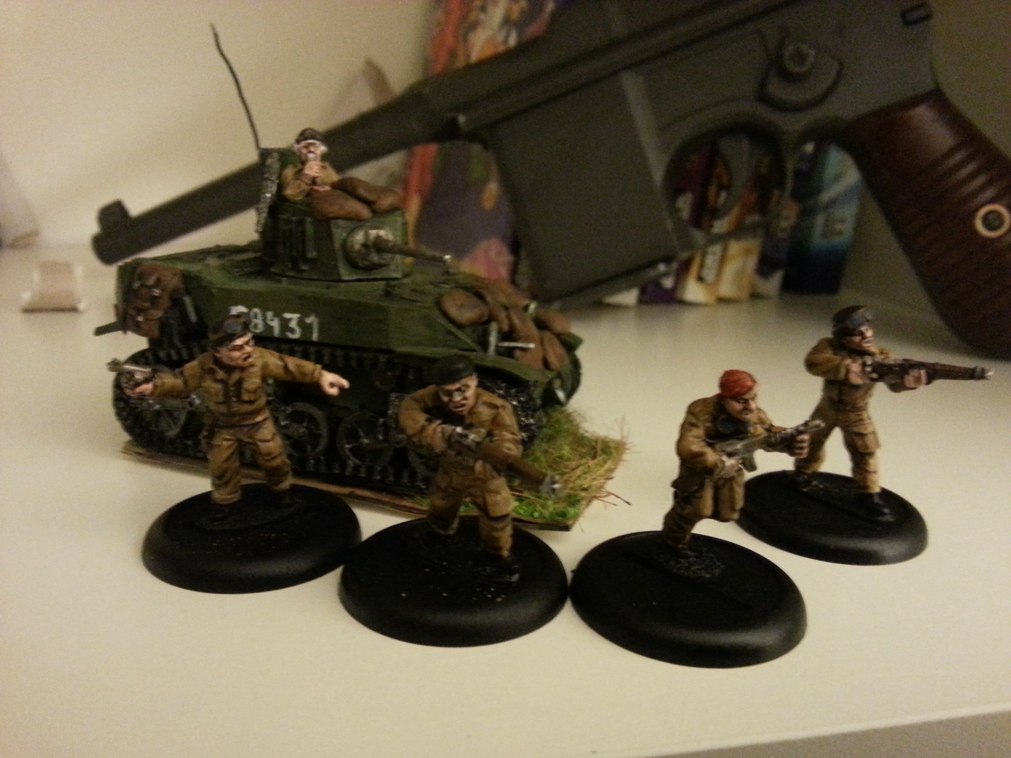 The models are black tree design british dismoumted tank crew. In game all crewmen carry sub machine guns. But i bend the wysiwyg rule a bit because i like to have fitting models instead of just four generic blokes with SMG's
