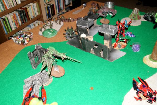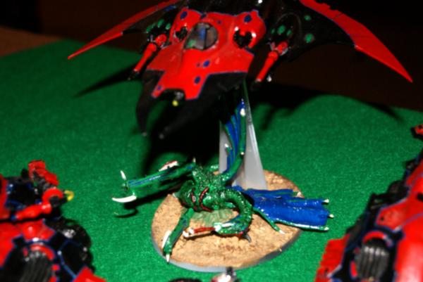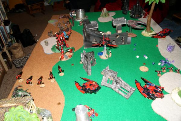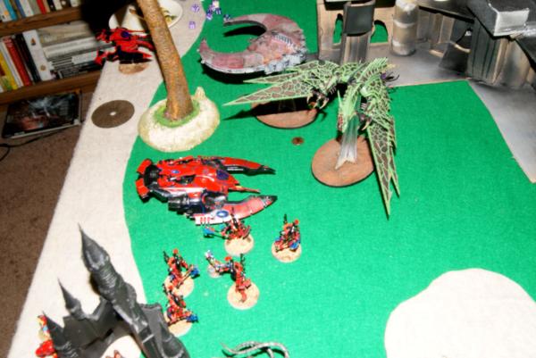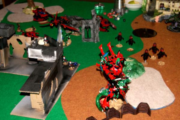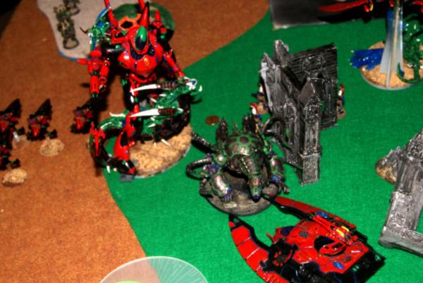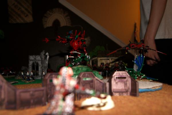 Crimson hunter knocked out the doom scythe, it fell on the fire prism but did no damage. Jet bikes and scatter serpent killed off the overlord. Dire avengers, bikers, spiders, and wraithknight were all able to move onto objectives.