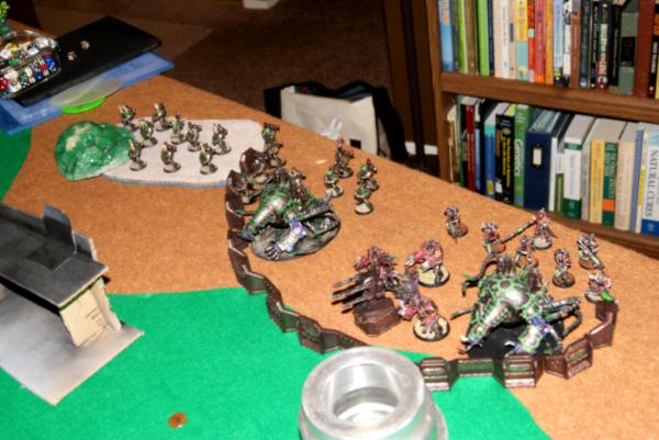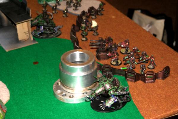 Aegis defense line was set up to the far right as I view the field. Quad gun manned by the warp smith who was joined by the obliterators. Two mauler fiends to the outside of him. Behind the fiends were the necron hq and troop. To the center, but still behind the ADL were his two squads of nurgle marked marines. His two flyers were in reserve.