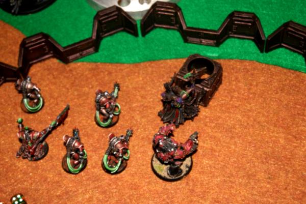 Shooting: Chaos marines whiff on the bikes, but warp smith and his buddies cause one wound on my wraith knight, he fails his save dropping to one wound remaining. Hel drake bakes three wraith guard. Doom scythe turns the hornet into a big crater.