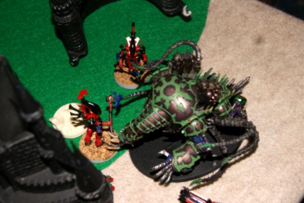 Mauler fiend manages one hit on a wraithguard and squishes him, melta follow up misses, leaving him still trapped in combat. Other then the mauler fiend, the only thin my opponent has left in his necron overlord.