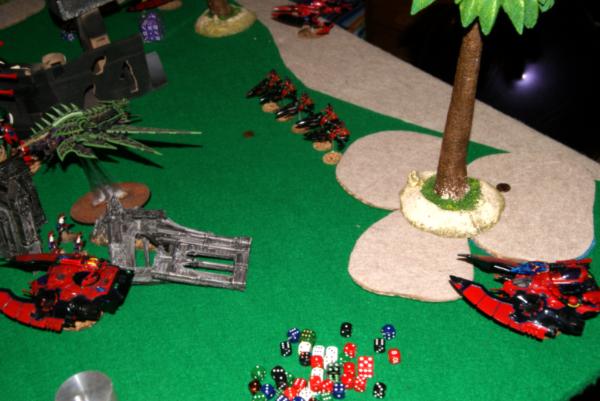 Shooting: Heldrake is shot out of the sky by my crimson hunter when it scores four all four hits and they turn into two pens and a glance. He fails all of his daemon saves. Doom scythe sustains four hits, decides to evade and still is glanced once. Wraithguard can't hit the broad side of a barn and miss their mauler fiend. Wraith knight glances the back armor of the left fiend. Dire avengers and jet bikes combine to kill two marines, leaving just the sergeant alive. Fire prism causes a couple of wounds, although they are saved. Warp spiders run and eventually assault move onto one of the nearby scouring objectives.