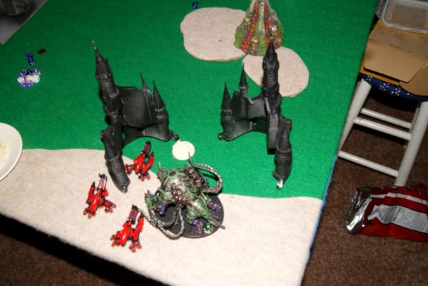 Both flyers come on the board. Heldrake does as I kind of wanted, slaps my warlord on the way past, and causes two wounds. (A little more then I wanted, but okay, one left.) The doom scythe comes right up the middle of the field and draws a bead on my wraith knight. The mauler fiends surge forwards. Center one coming up against the ruins in the middle of the field. The right one hugging the side of the board. Oblit and warp smith step out in front of the ADL to get into range of assault cannon on the wraithknight. Necron ground unit spreads out to avoid blasts.