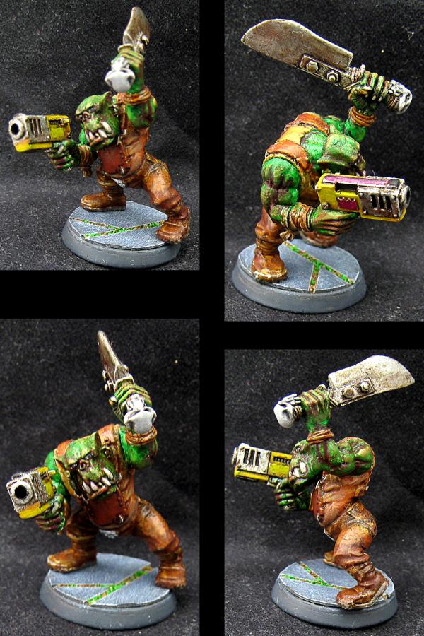 Rummaging through bits (which came via mixed-bitz-lot auctions) I put together an ork, to experiment a bit and practise with handbrush.