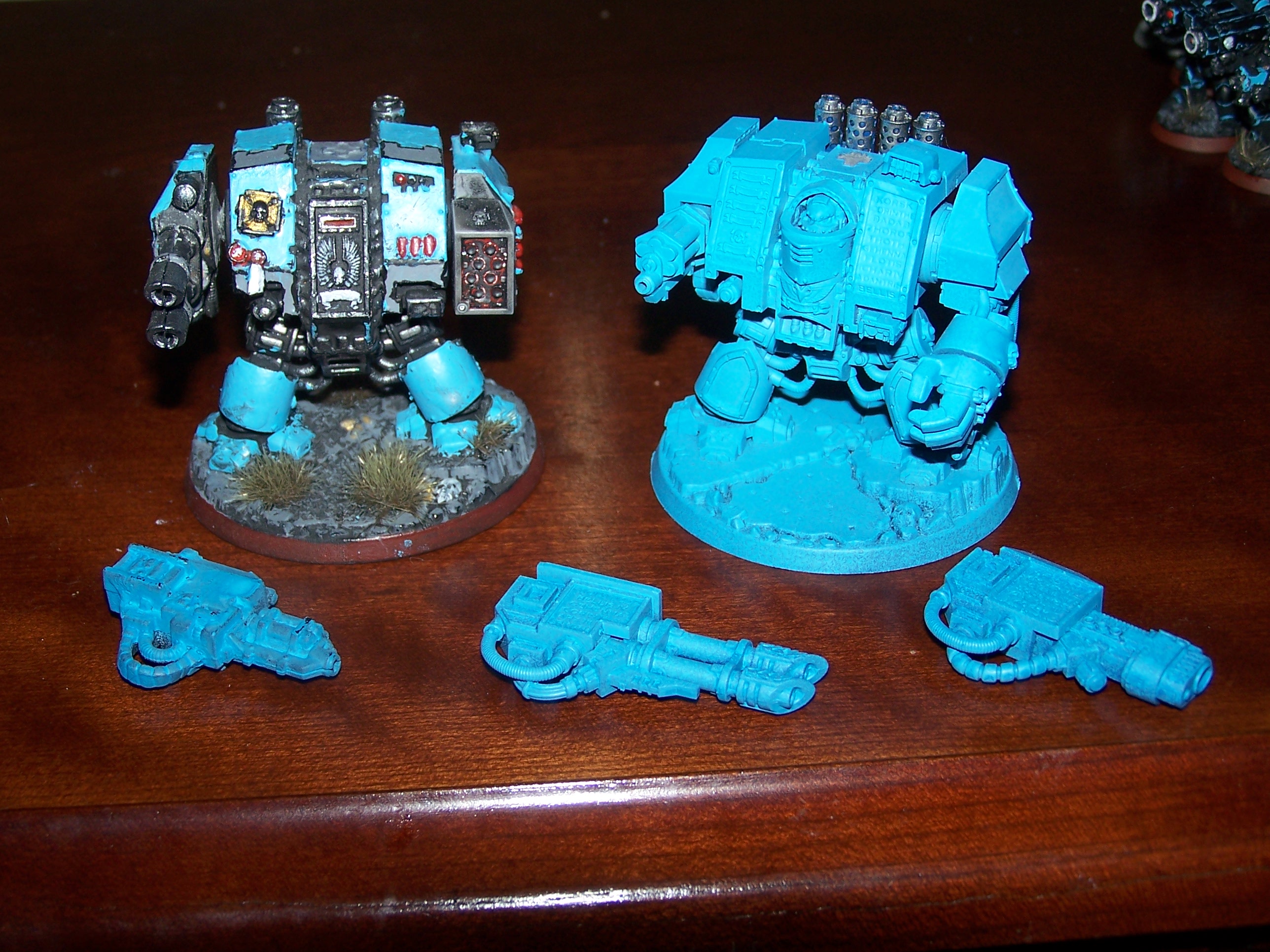 2x Dreadnoughts (1 with TL Lascannon and Missile launcher; 1 With Assault cannon and close combat weapon; 1 Plasma cannon arms, 1 additional TL Lascannon arm, 1 additional assault cannon arm)