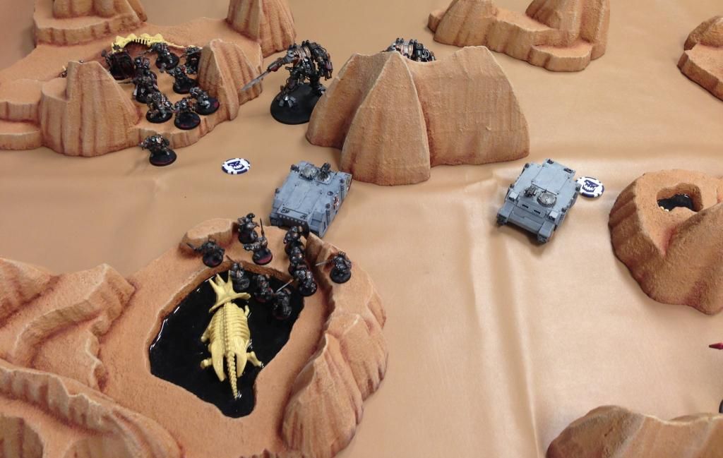 We place the objectives symmetrically with 2 in the middle, one in the back right under the NDK, and the last in the bottom left. Evan's deployment is easy to read with the picture. Terminators with the GM on the left, rhino squad, NDK, rhino squad, NDK.