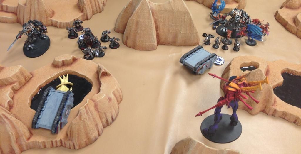 I deploy with a mostly refused flank except for my walkers which went on the left behind a tall BLoS hill. Wraithguard serpent is central and mostly blocked. Wraithknight up front with his "shoot me first" sign. Beasts with all 3 IC's attached in a big screen in case either NDK shunts up in my face right away. Venom, artillery, and avenger serpent are in the back/bottom right. Bikes are reserved. I don't attempt to seize.