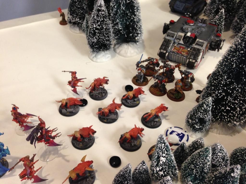 Beasts make their assault into the strike squad who's rhino just got wrecked. I was pretty spread out so didn't get too many attacks. Both sides take a couple casualties and we lock.