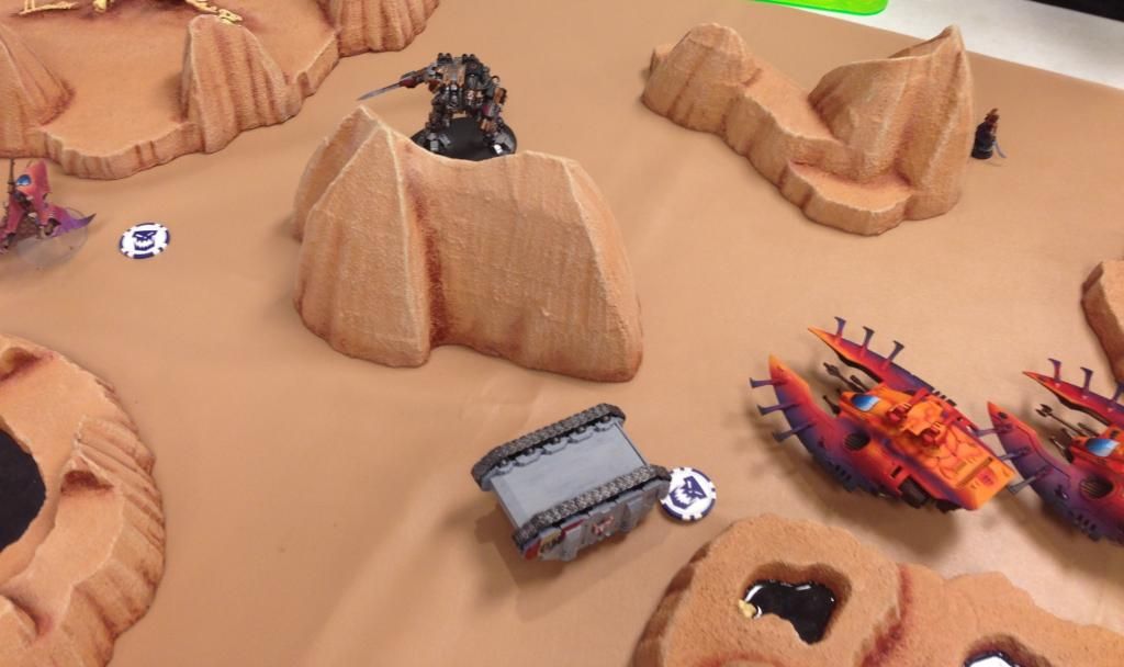 Since this was the GT primer, we used missions from the GT packet. Game #3 had the BGNT as primary (20 battle points) and The Scouring as the secondary (10 battle points) and the standard bonus points for linebreaker, warlord, and first blood (1 battle point each) making each game worth 33 battle points max. There were 6 total objectives worth 3,3,2,2,1,1 victory points with heavies scoring for the primary and fast attacks scoring for the secondary. Deployment was Hammer/Anvil.