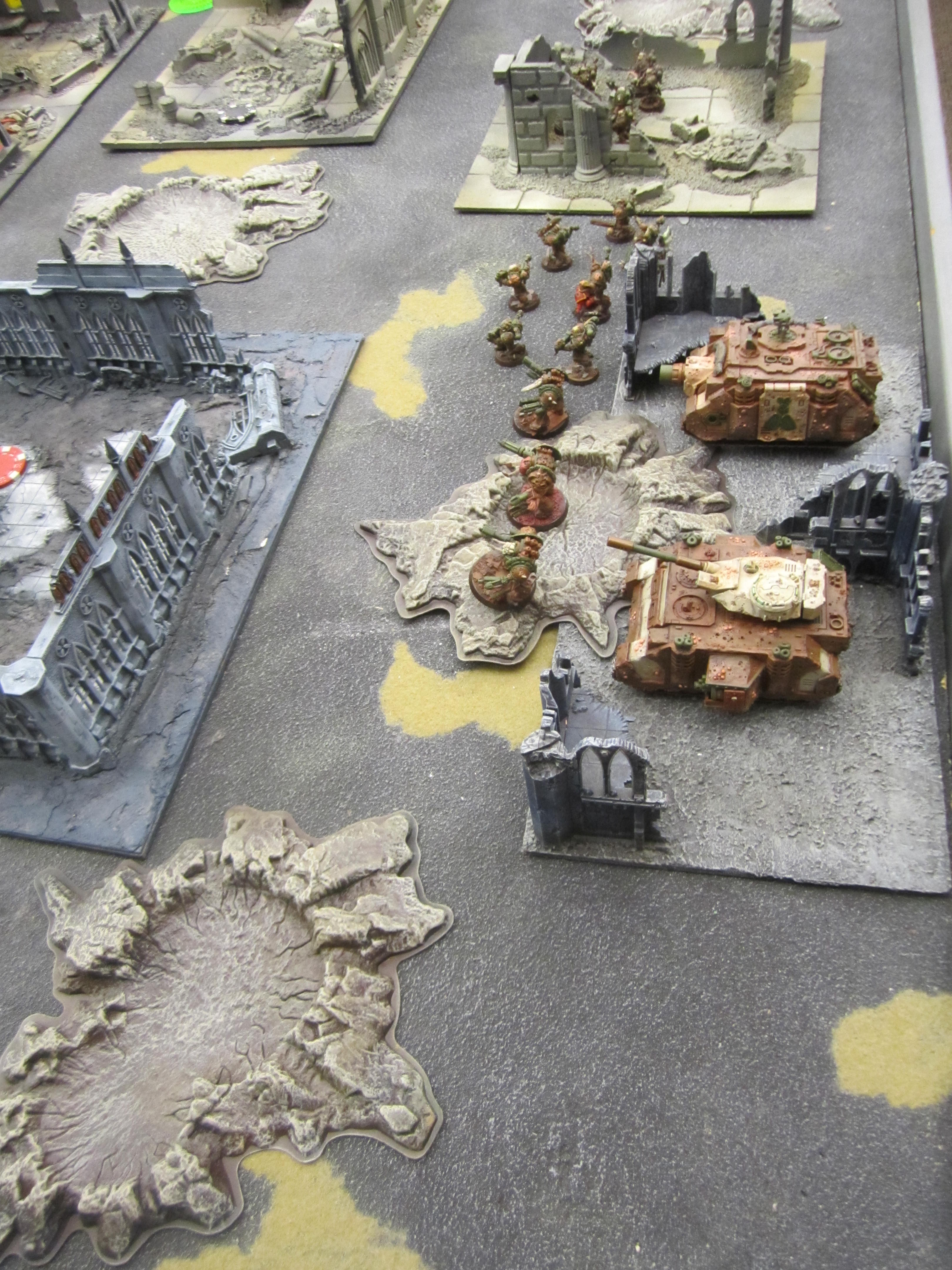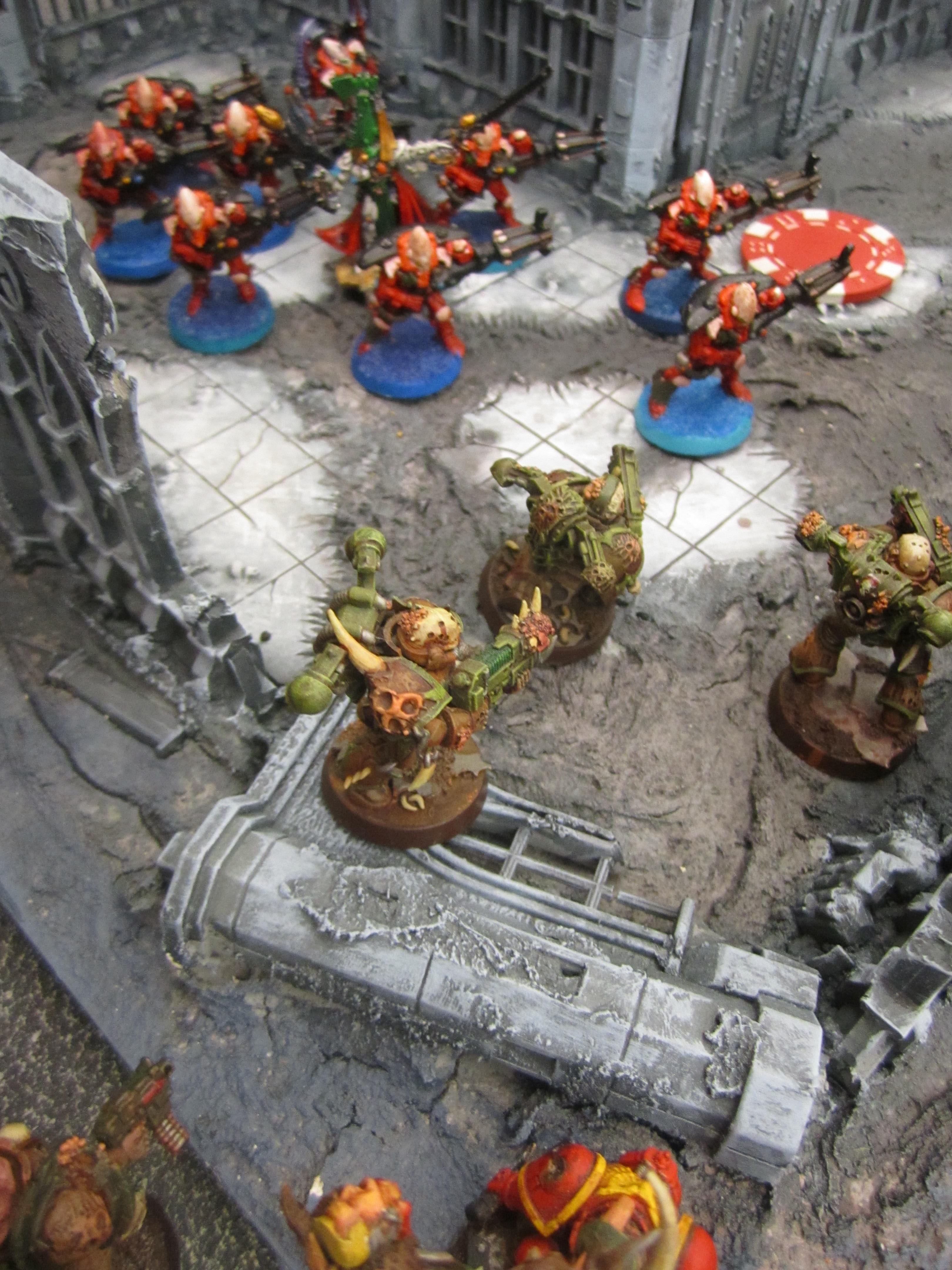 On the face of a lost Archeotech planet the warriors of chaos move against Xenos scum in a race to secure a relic of unimaginable power. Entering the system aboard the flagship Destroying Angel, the heretic forces of the Mortise Apostate, foul warriors in the embrace of Father Nurgle, decended on the surface of a destitute world of little note. Surrounded by a swarm of support craft, the leviathan flagship swung ponderously into low orbit above the swirling dust storms and twisting gas clouds of the world below. Radiant light from the dying sun painted the normally dull brass and corroded alabaster plates of the Destroying Angel with rare and brilliant streaks of color. They illumiated the many teired decks and vast gunnery platforms that sprawled across the upper deck of the ship like some huge charnel house. Massive seige cannons tracked across the surface of the planet, following points unseen below the drifting clouds. High on the command deck, Morbus, resplendent in his many gifts of nurgle paced amongst the constant buzz of attendent flies. One eye, white and corrupt drooped and sagged baglike from its socket. The other, alive and clear scanned the data streams feeding up from the planet below. Idyle he brushed a fat white maggot from the lid and turned to face the corrpulent bulk the towered behind him. Huge batlike wings spread and contracted, seeming to embrace the shadows within the ship. A gas mask the size of an average marine dangled limp and trunklike against the wet bulk of a rotting and putrid chest. Massive arms, long and apelike hung slack at the sides of the 8 meter hulk that rocked slowly from one bare corpselike foot to the other. Behind huge wet lens Morbus could just make out the small, luminous green eyes of the beast watching him keenly. He knew better than to mistake the slow passive motions for those of a weak, rotting corpse. Morbus had seen the beast rend his predecessor limb from limb in a fit of pique. Morbus had learned from the experience. That was how he had remained in his post so long. Morbus cleared his throat. " We have reached the planet Lord". The words were slow and rasped wettly from his bloated and peeling lips. "Scans show the presence of xenos taint upon this world, our sorcerers bear grave news as well. There is a disturbance in the warp...another fleet this way comes. Followers of the false emperor...." His voice trailed off in a rattle. The massive bulk of He who Flies pulsated slowly, wings spreading and closing in time to the slow metronome like pulse and gurgle of the gas mask swaying and thumping upon its chest. Huge hands the size of a mans body clenched and unclenched to the unheard beat. A massive nail, cracked and blackened with mold and dripping ichor dragged slowly across the steel deck. It screeched and struck sparks in its wake. Morbus held his rotten breath as the arm continued to rise sweeping slowly past his face. It halted pointing at the massive view port that spread like a chasm across the 100m face of the command platform. "gggGGGGOoooooo........" Morbus bent his head low in suplication and backed cautiosly away to take a knee, dwarfed by the mighty bulk which stood silent, pointing through the view port into space. "Your will is done my lord". Moments later the plates beneath his feet shuddered, siege cannon of unimaginable power belched death onto the surface of the world far below. The invasion had begun. The mortise apostate participated in the first of a series of raids against the xenos Eldar scum on the 19th here in Oakland California. The below photos detail my first engagement against the eldar since they recieved their new codex. G3 runs games that are focused on showcase armies, good sportsmanship and narrative gaming. They do not encourage WAAC gaming at their events which are typically invite only. I brought 1250pts of nurgles finest to the match. My list, Lord Morbus CSM lord with Black mace, 4++ 2x7 plague marine squads 3 Nurgle Obliterators Vindicator Predator with AC/HB Herald of Nurgle with 14 Plague bearers. My foe (forgive me, that i dont know the names of most eldar units) Autarch with warp spider jump pack Large squad of warp spiders Fire Prism Flacon 2 x Wave serpents 2 squads of Guardians in the wave serpents a small squad of Dire Avengers in the Falcon. We were playing dawn of war, with night fighting in effect for the first two turns (though i didnt know it would remain in effect this long, and playing a capture the objective game. 3 objectives were placed in a line down the center of the table. They were worth varying amounts to both players, though neither of us knew what the others objective was. I had to capture the three objectives worth 1, 3 and 2 pts. I also received bonus points for a number of secondary objectives. Typical of games i play, I lost the initiative and my foe elected to go first. Rounds 1-2. My plan was to hug cover while pushing for the red 3VP token and the black 2 VP token with my army, and then just try to hold my ground. Little did i know that eldar wave serpents are nigh invulnerable to enemy fire especially when its night fighting. My opponent set up in a line with a falcon on his right flank and then two wave serpent positioned so that they could speed toward either flank objective. His autarch and his warp spiders used the ample cover provided by a massive ruin in the center of the board to threaten the center objective. I positioned with my forces arrayed so that the bulk of my force could hopefully take the center red and my right flanks black objective, hopefully allowing me to win. Rounds one and two my opponent moved up and took both the green objective on my left flank and the black objective on the right flank. He fired an amazing amount of shots at me, but thanks to my cover saves and the fact that it was night time (and i was playing plague marines), my units survived with only one casualty to enemy fire, and he scored first blood by atomizing my predator i
