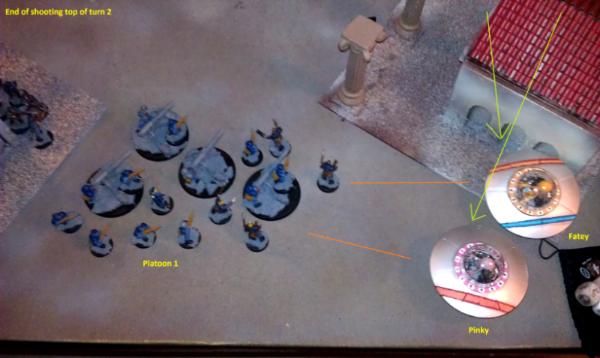 Platoon 2 receives BiD orders and targets pinky. 8 tl shots, 1 hit, and 0 wounds.