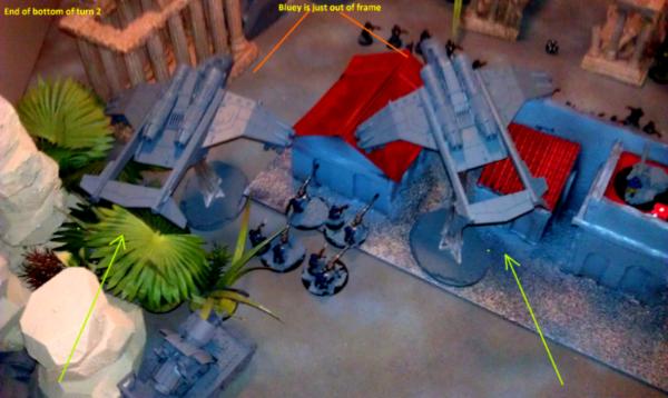 Thoughts: It was lucky to get all my reserves in this turn. Marbo did some damage. Platoon 2 did some serious damage to H3. My hope was that the vendettas would encourage his princes to land.