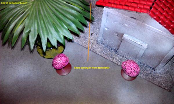Thoughts: Yikes! I am seriously concerned. I did very little damage and the daemon princes are going to be on me next turn. I forgot to use FNP in turn 1 and would continue to forget the rest of the game. I forgot to use the search light on the demolisher. I could easily blame the dice for a bad turn of shooting, but the blame is really my own for forgetting my own options and abilities.