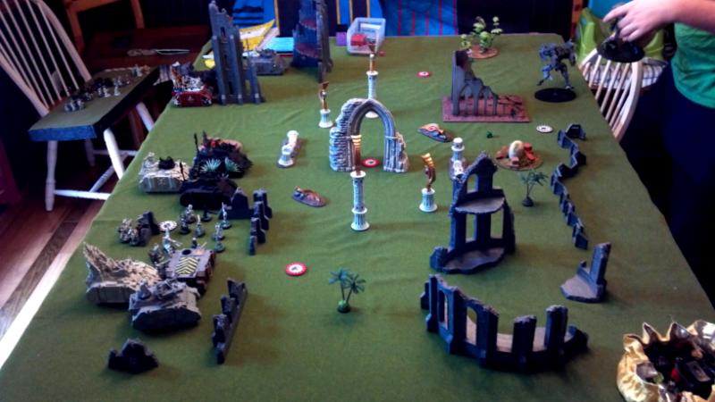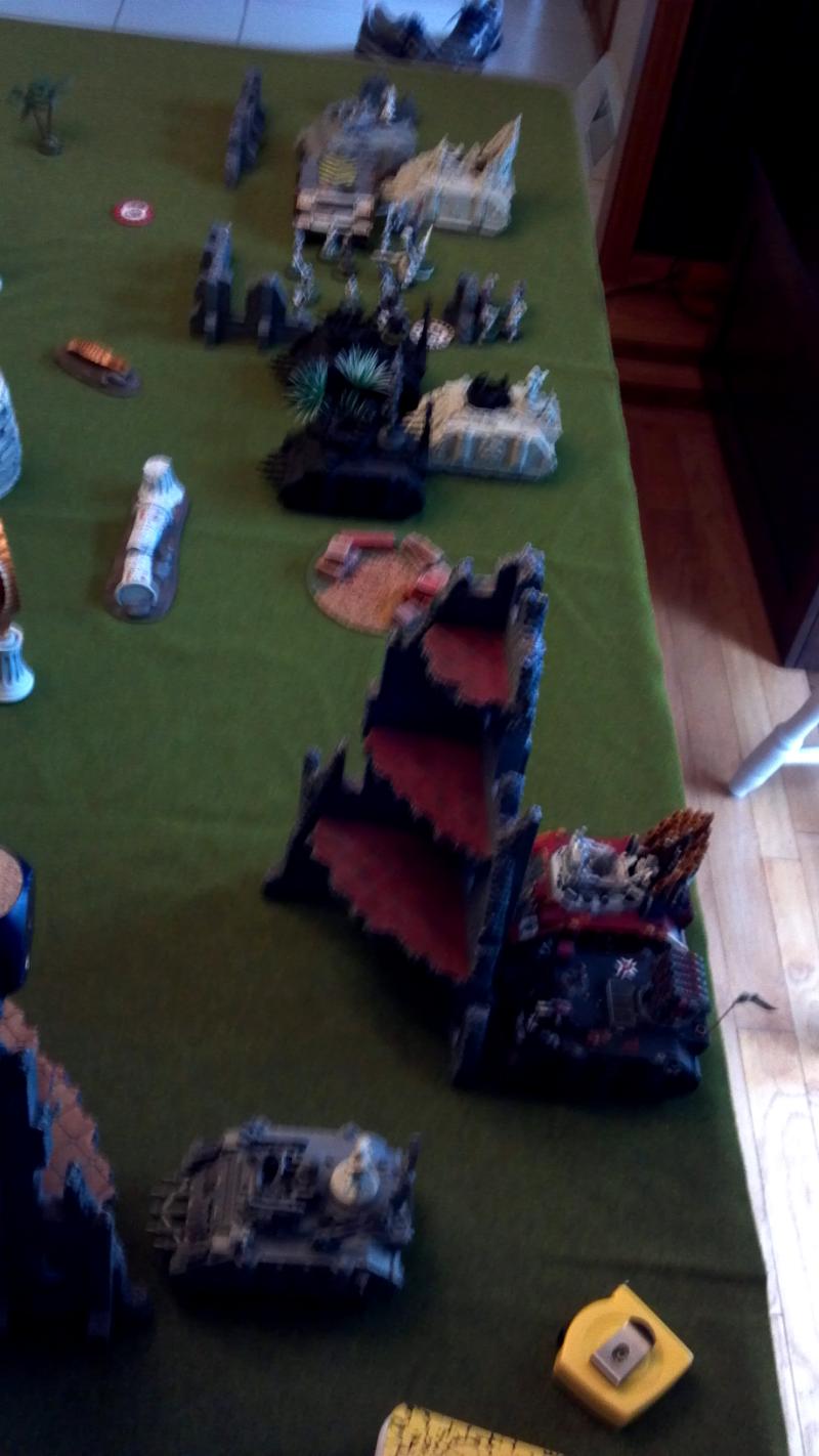 My side of the board will be referred to as the bottom of the board - my opponents the top. In the center there was an arch that the arched was wider from left to right on the table, around it were broken pillars giving small area terrain. On the left lower board was two wrecked buildings facing eachother, on the bottom right were walls from wrecked builings forming a loose square. In the lower center was a small cd sized area terrain, the sam was on the upper middle table. The upper right side had 3 pieces of terrain that formed a loose circle like colliseum. the far left upper side had a cd sized forrest terrain and to the right of this by 6" was a ruined building.
