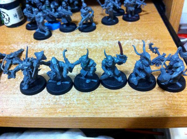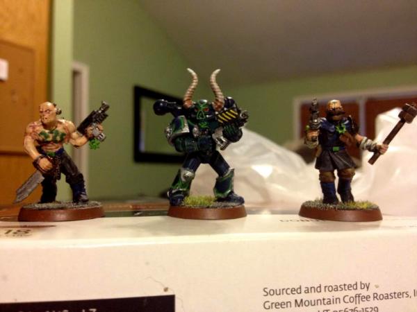 My nurgle cultists are "finished' but they were a pretty quick job, largely with airbrush. Not very proud of them, but they suffice for such cheap troops. First time using pigments and almost solely used Minitaire paints for them which took some getting used to too. There's 40 of them, this was just a pic to get an idea of what they all look like. Badablack and Spork, I like yours.