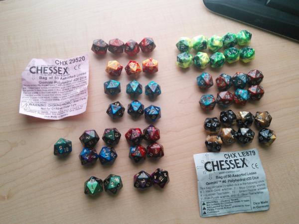 D20s each for Infinity. After taking some for myself and a friend, I've got about half (52) leftover.