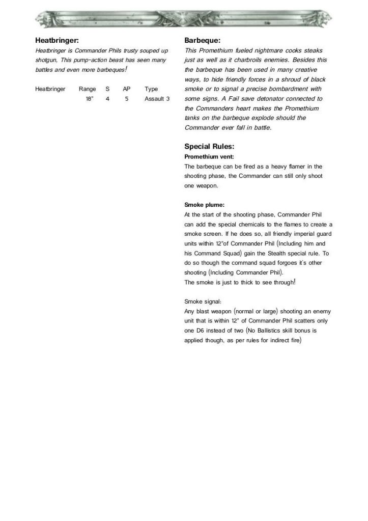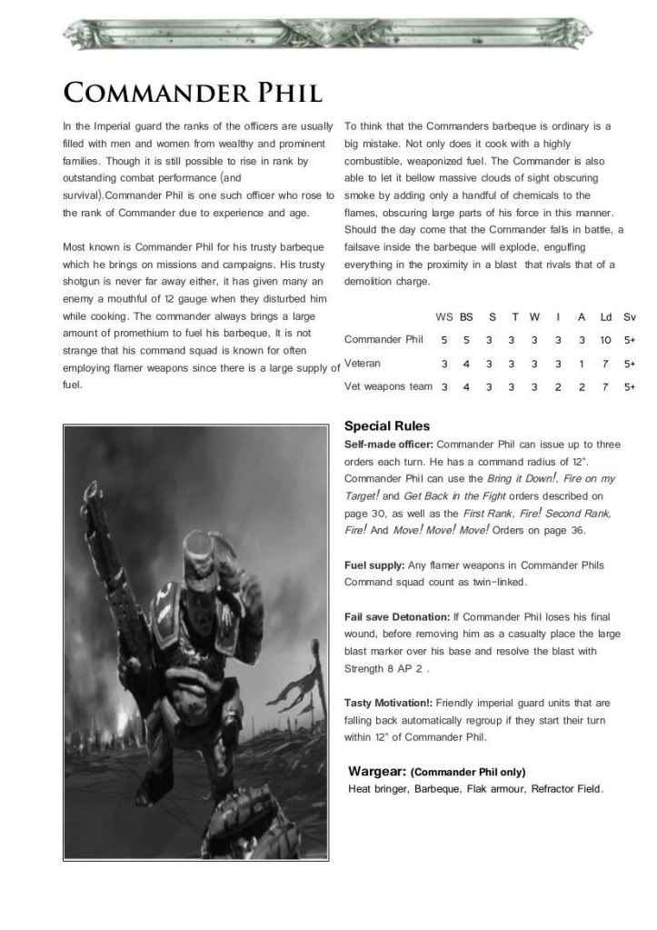 i will use him with a Camo cloak( to represent the smoke that the BBQ gives off) +1 cover save and BS of 5 if shooting creatures that can be cooked haha