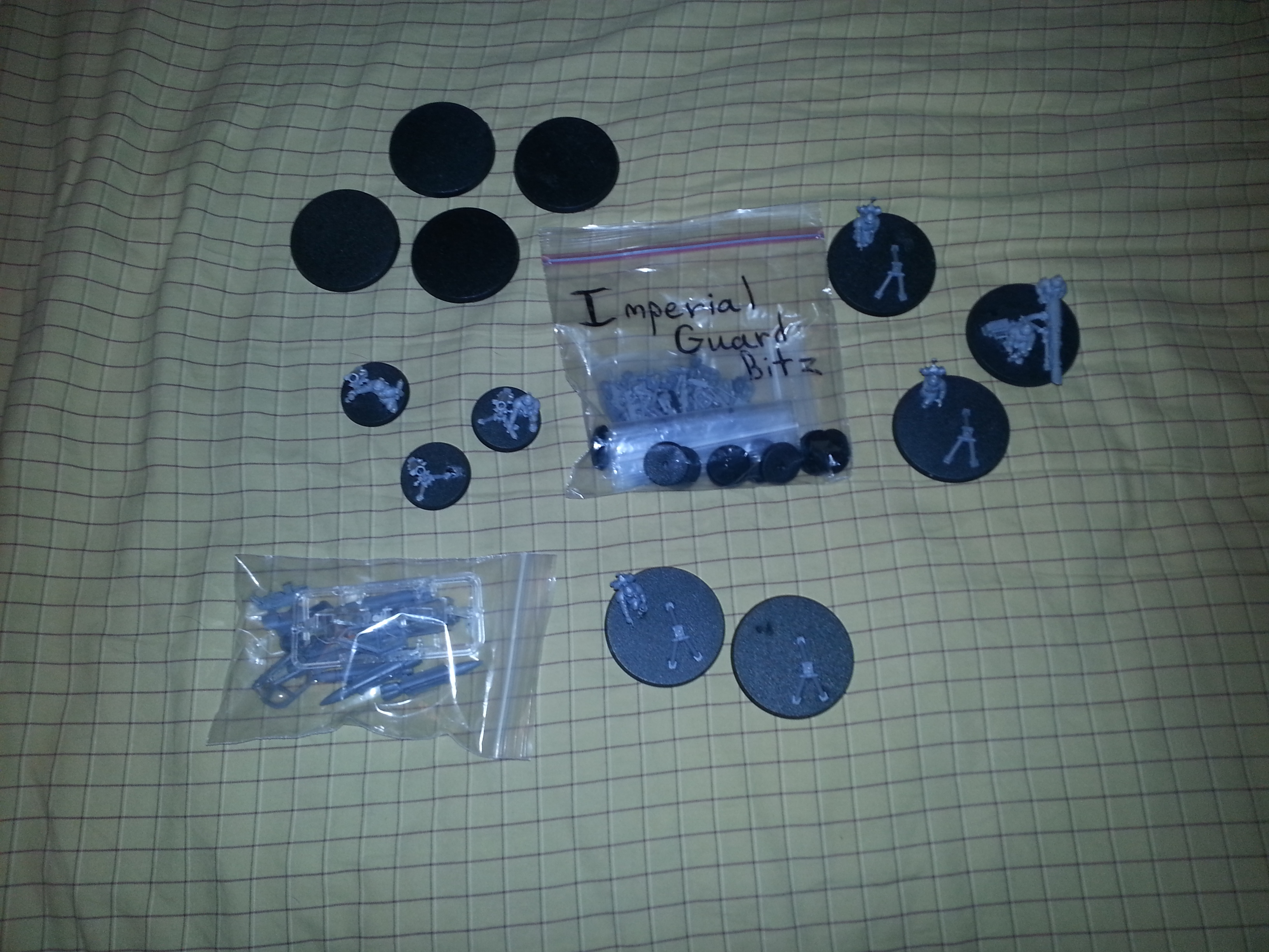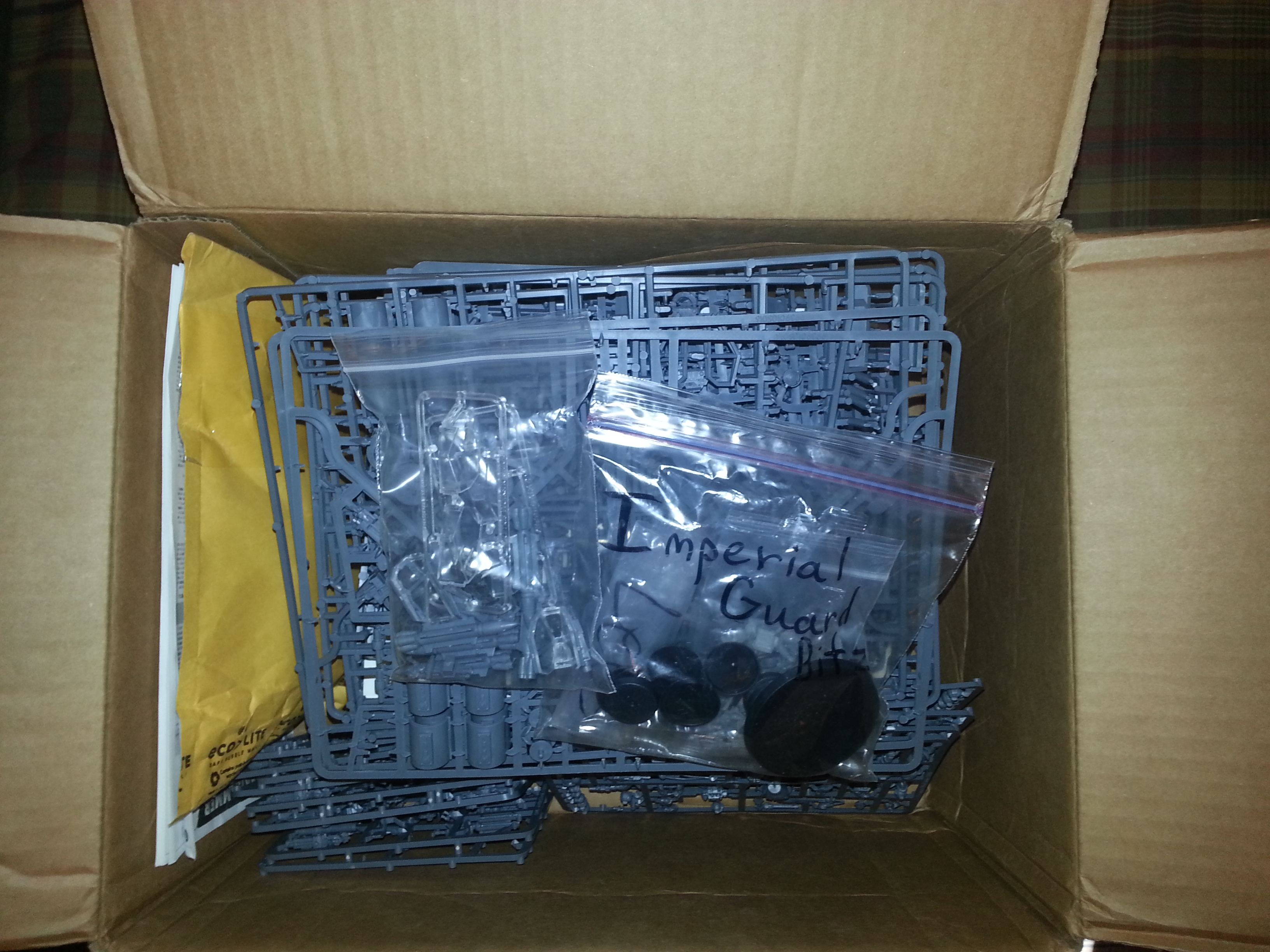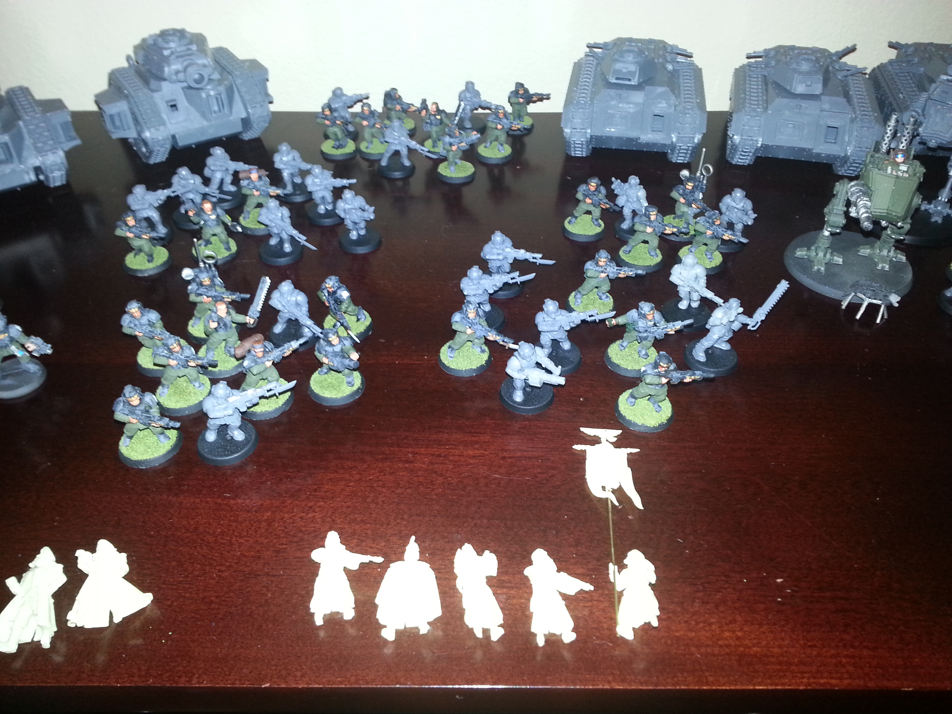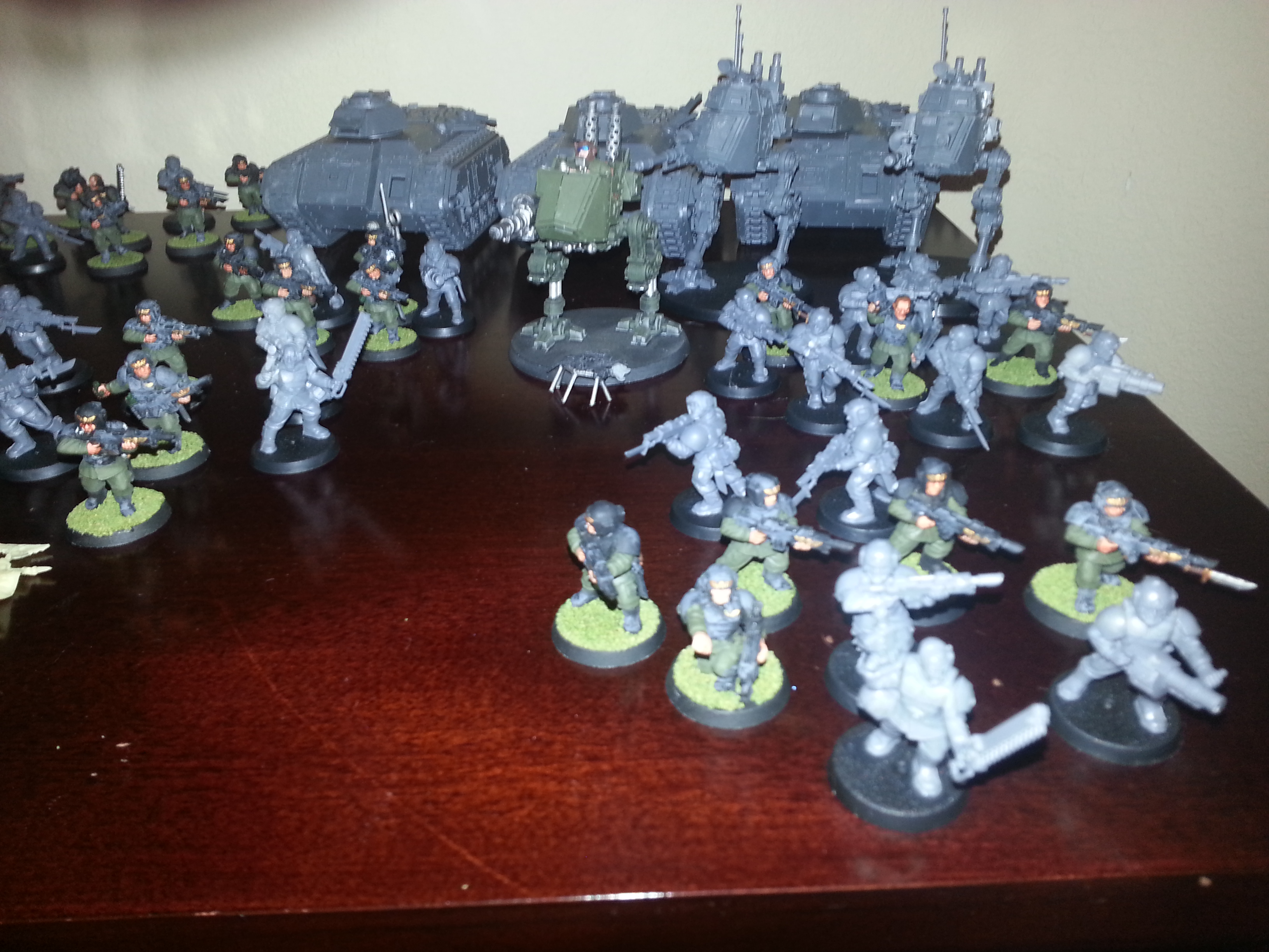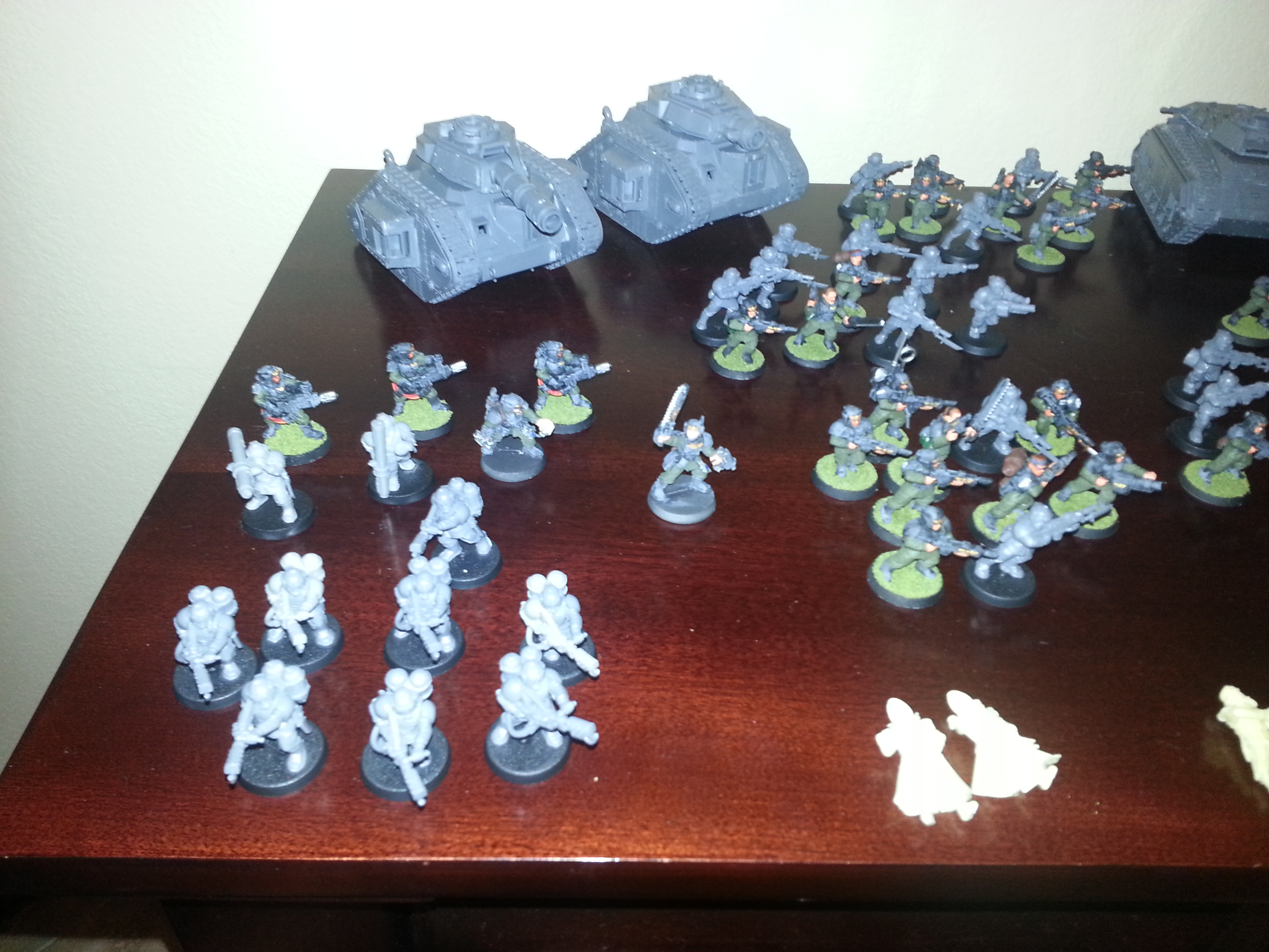 Hello everyone! I posted my Skaven army in Ebay and got an awesome deal from the army! Now for the last and final army I have: Imperial Guard. This set is used and has had some good and bad rounds. I'll post the army specs then as best as I could of the rest of the army. 70x Shock Troops (Some have been painted, some have not but they are in set on there platforms ready to fight!) (I also have some other troops in the mix but they cannot be made into a 10 man group.) 3x Chimeras (The main weapon is not glued on as well as the front weapon. 2x Leman Russ Tanks (Both of these tanks have their guns magnetized: one has the original gun while the other has the Demolisher.) 3x Command Squads (One is unopened still brand-new in bag [actually has been open but still on sprues], one is Death Korps, and the other is a metal Command Squad.) 3x Vendettas (These three ships are built and ready, but the only thing I have not glued are the missle pod, lascannons, and the cover for the top of the ship.) 2 1/2x Heavy Weapon Squads (I have two weapon squads that are not glued with the weapon of choice. Some have been removed from their platforms and as for the half squad, I only have 2 single guys on platforms.) 3x Scout/ Armored Sentinels (I have two magnetized, which are the two that are not painted, while the other is not magnetized.) In the box with the bits, I have a great amount of sprues for each set of guys I currently have: Command Squad (still on sprue,) Shock Troops, Chimeras, Leman Russ Tanks, Vendettas, Heavy Weapon Squads (also have platforms of a set of 3,) and Scout/ Armored Sentinels. This is what composes my army. If you would interested in my army, message me. Here are some pictures. Price I want for the army is $500 + $20 shipping. I can haggle the price if you want.