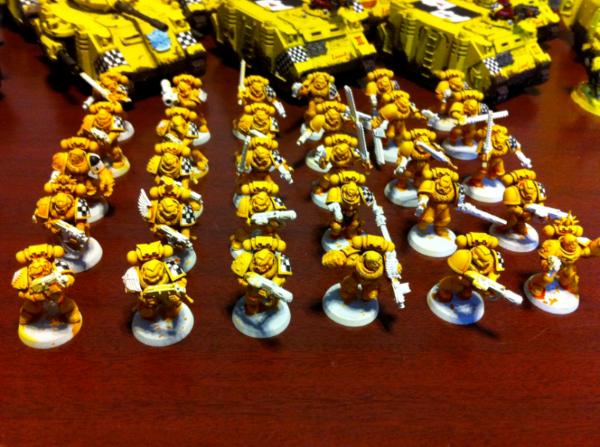 If I'd make a yellow army I would spray them black first, spray white over it in light strokes, so you'll get a darker color in the recesses for shading purposes but not necessarily needed. (Or just a white basecoat.) Then use a few layers of the Casandra Yellow wash over it and repair the flaws with Yriel Yellow.