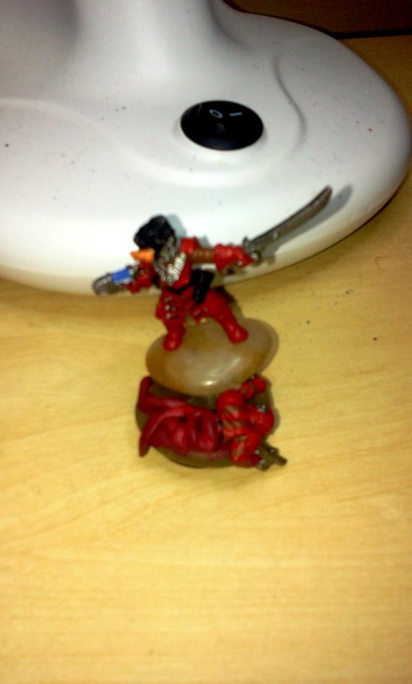 Looking at it here, the red of the guts compared to the red of the uniform looks really similar... but in RL they're very easily distinguishable - the red for the guts is Khorne Red mixed with spots of Wazdakka red, and the uniform is Mephiston red with Mournfang brown stripes.